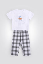 הסט מורכב מחולצה עם צווארון עגול, שרוולים קצרים וסיומת מנג’ט ומכנסיים ארוכים עם גומי במותניים.