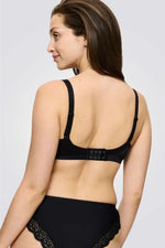 חזיית מינימייזר מבית המותג TRIUMPH בצבע שחור בעלת עיצוב חדשני ורך בעלת ברזלים לתמיכה מירבית, עיטורי תחרה בחלקה הקידמי של החזייה ובחלקם העליון של הקאפים, סגירת קרסים אחורית רצועות מתכווננות וללא ריפוד.