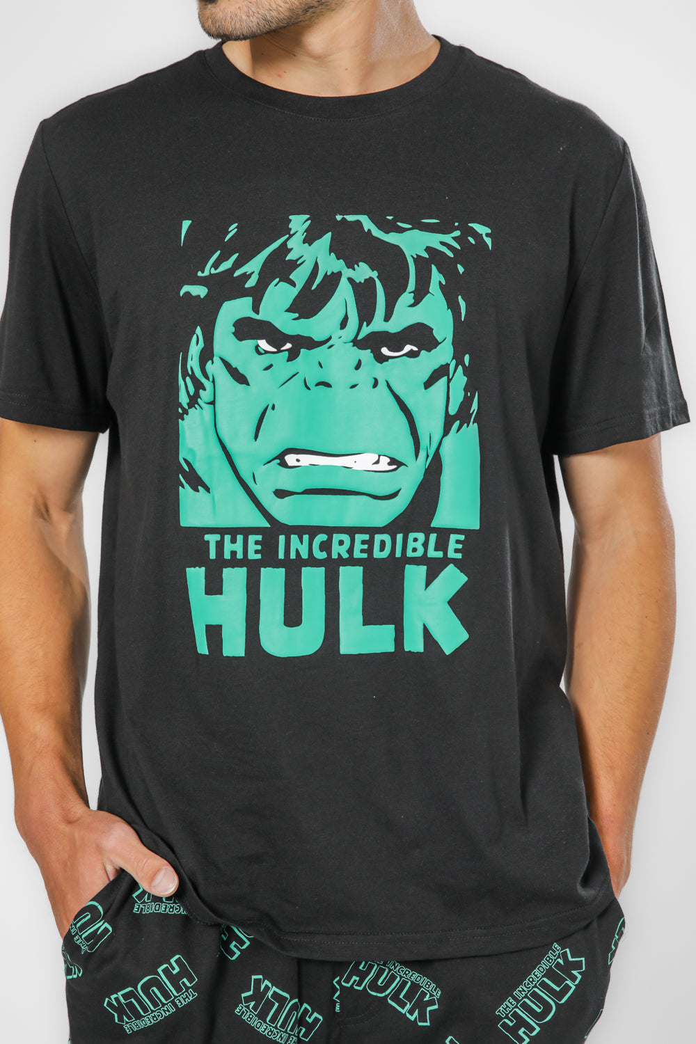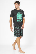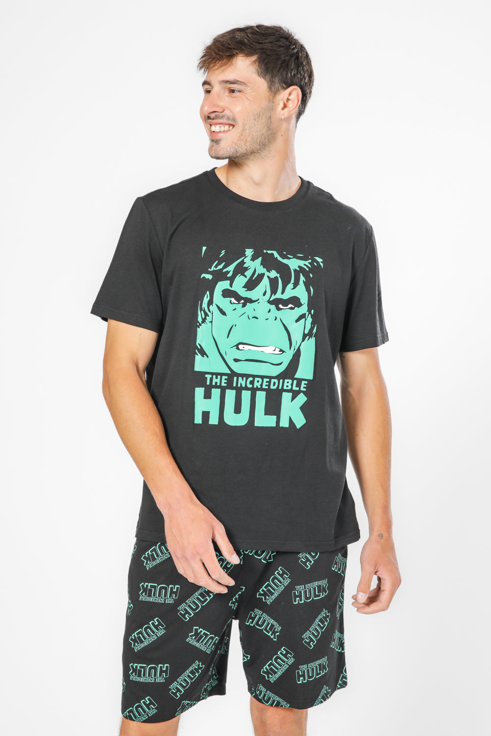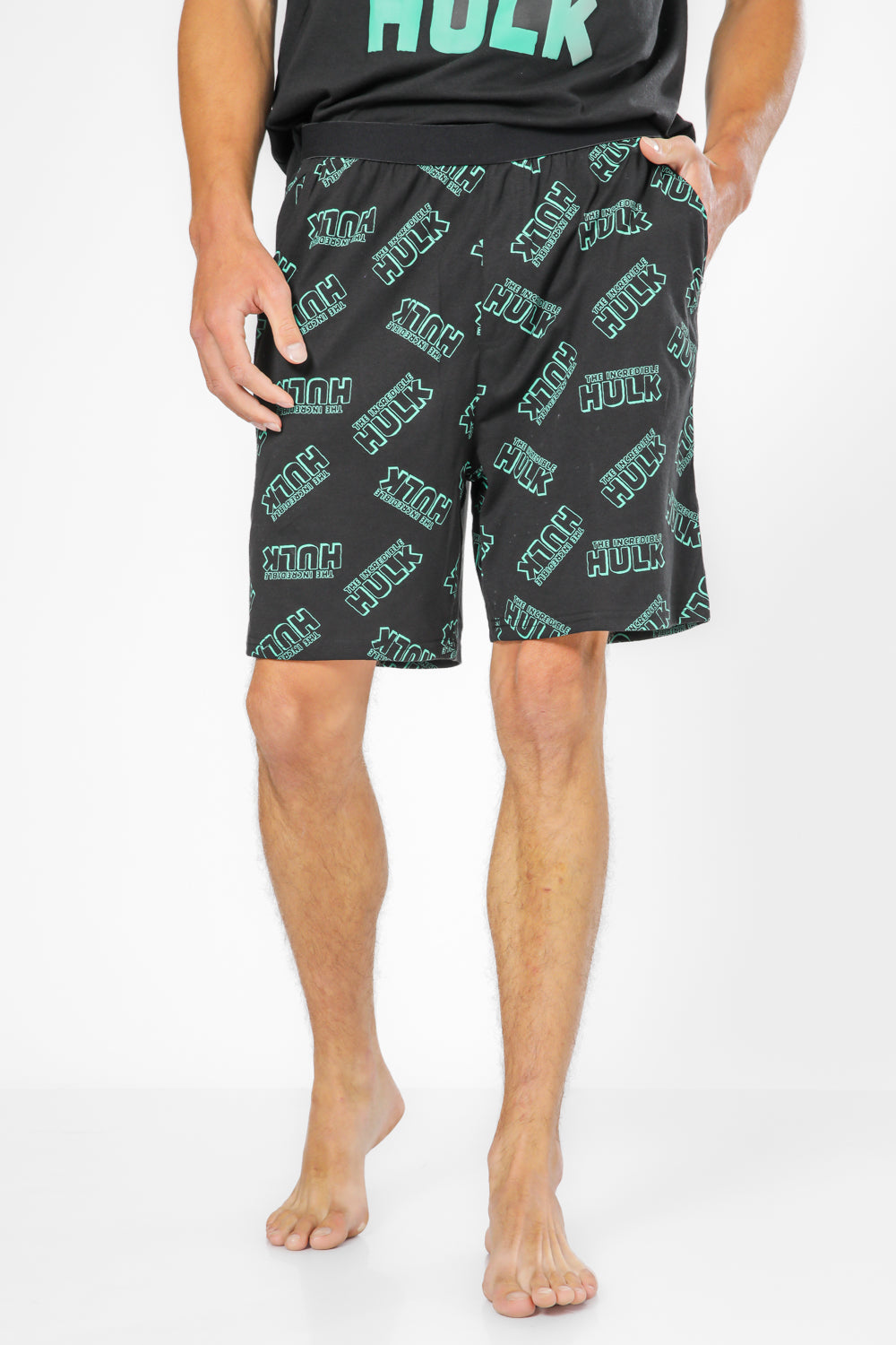 פיג'מה מבד נעים ונוח בצבע שחור, בעל הדפס של הענק הירוק, סט של חולצה עם שרוולים קצרים עם מפתח צאוור עגול ומכנסיים קצרים עם גומי במותניים.