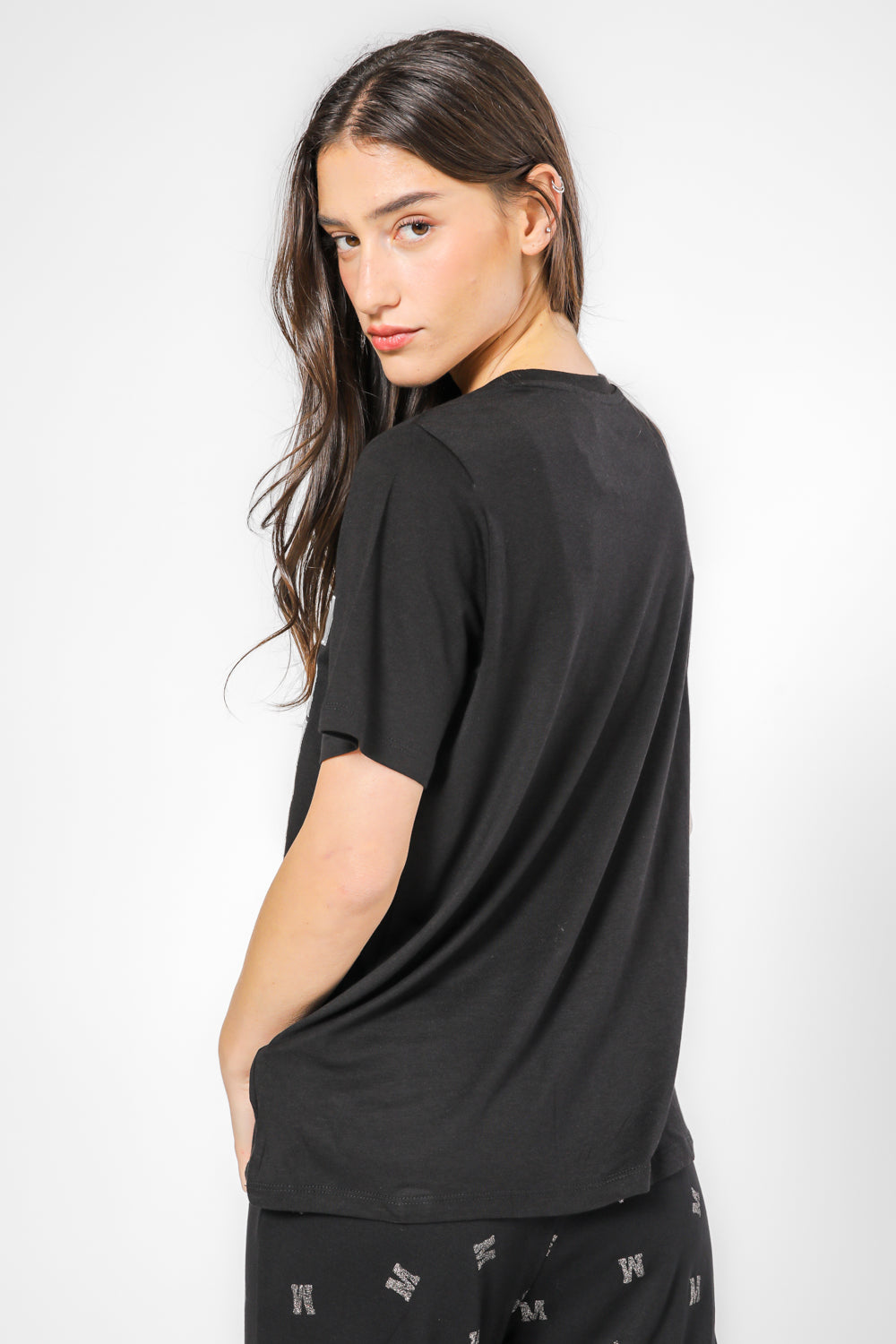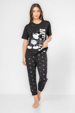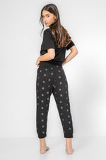 חולצה עם צווארון עגול ושרוולים קצרים ומכנסיים תואמים באורך 3/4 עם גומי, שרוכי קשירה וסיומת מנג’ט.