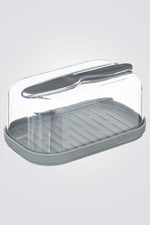 כלי מפלסטיק לאחסון חמאה עם מכסה תואם וסכין בצבע אפור.