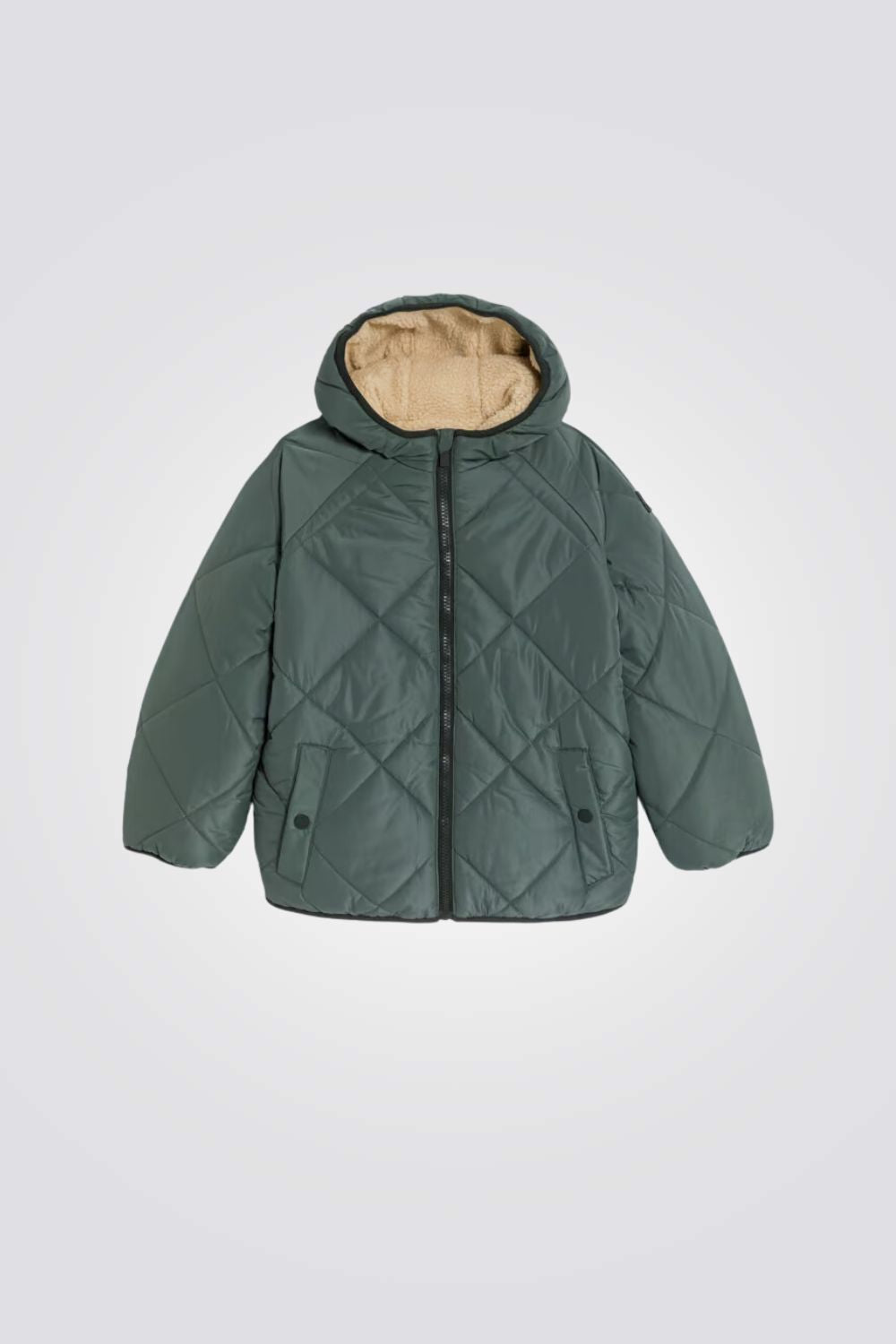 מעיל לילדים מבית המותג OKAIDI, בצבע ירוק חאקי, מחמם ,נעים ודוחה מים, עם כובע , סגירת רוכסן ושני כיסים צדדיים.