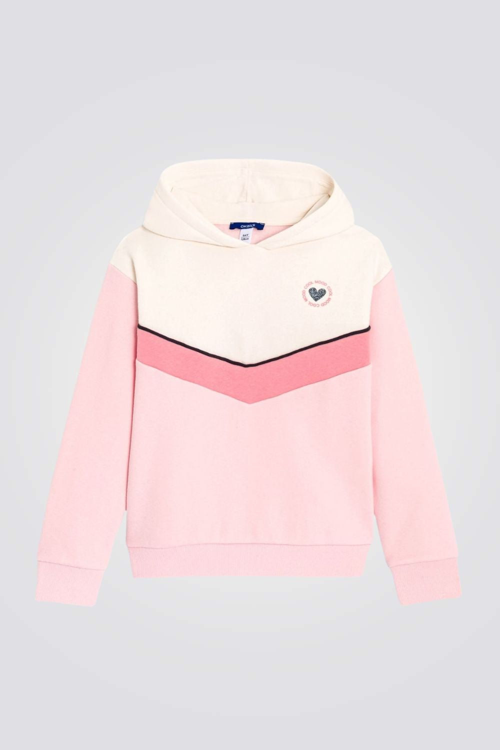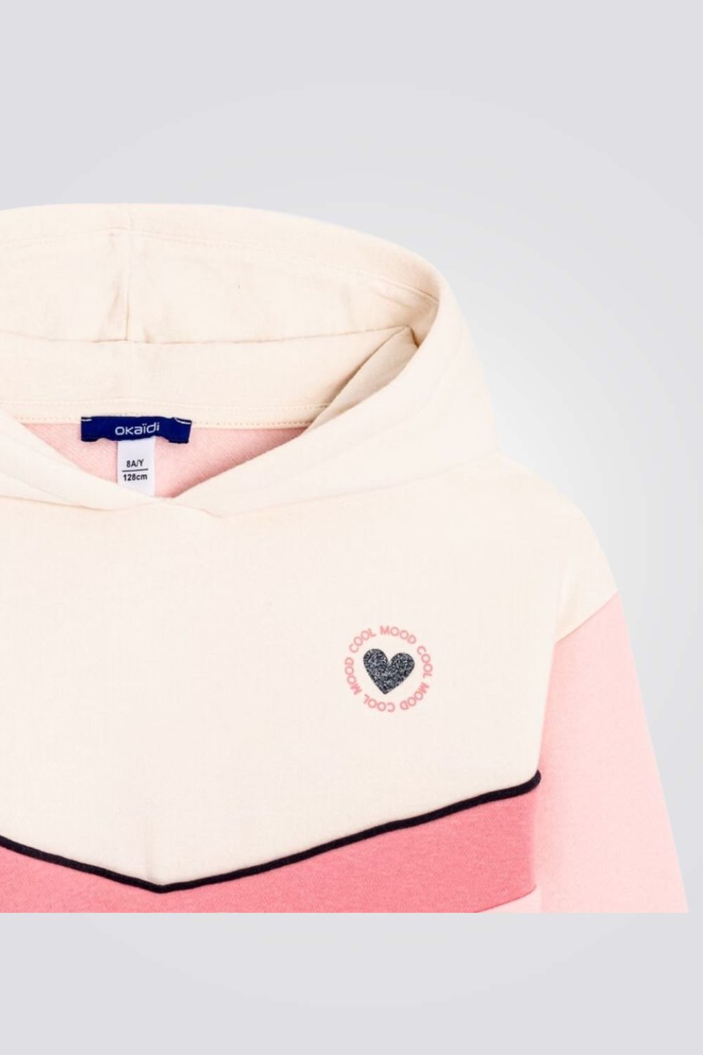 סווטשירט ילדות מבית המותג OKAIDI, ,עם קאפוצ'ון למטה ורוד כהה למעלה בהיר,50% סיבים ממוחזרים.