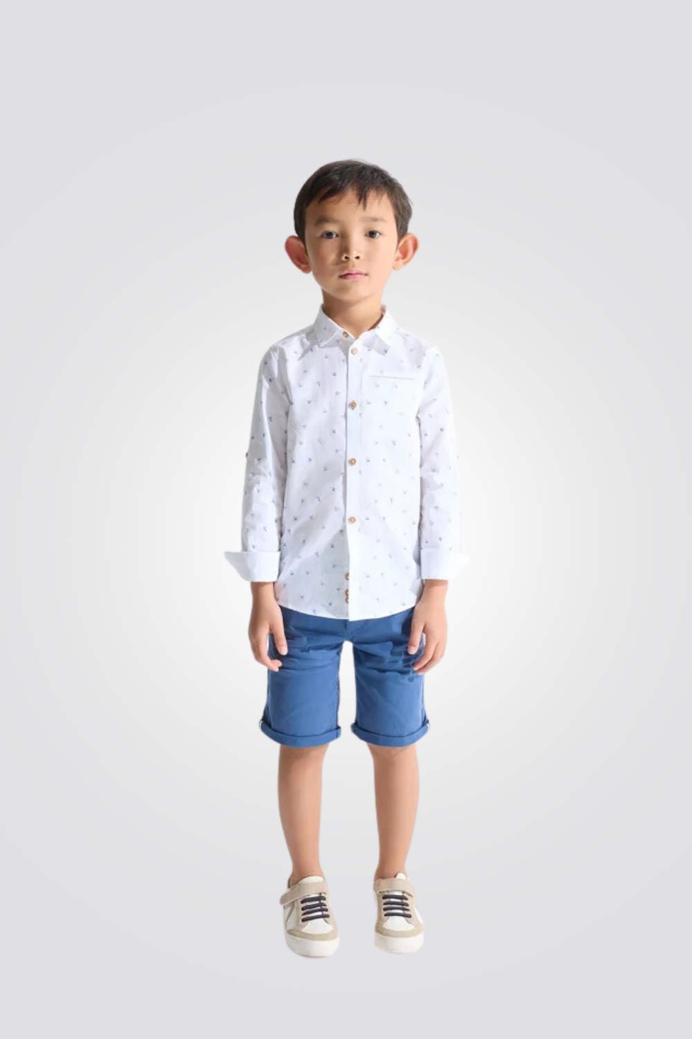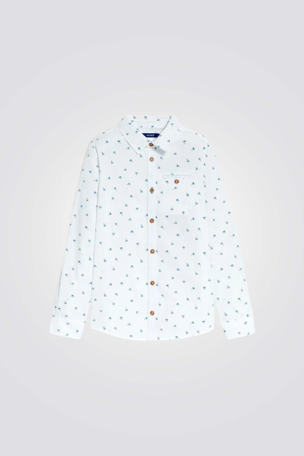 מכופתרת לבנה לילדים מבית המותג OKAIDI, עם הדפס עצי דקל , צווארון קלאסי ושרוולים ארוכים , כיס בחזה ופתיחת כפתורים מקדימה.