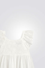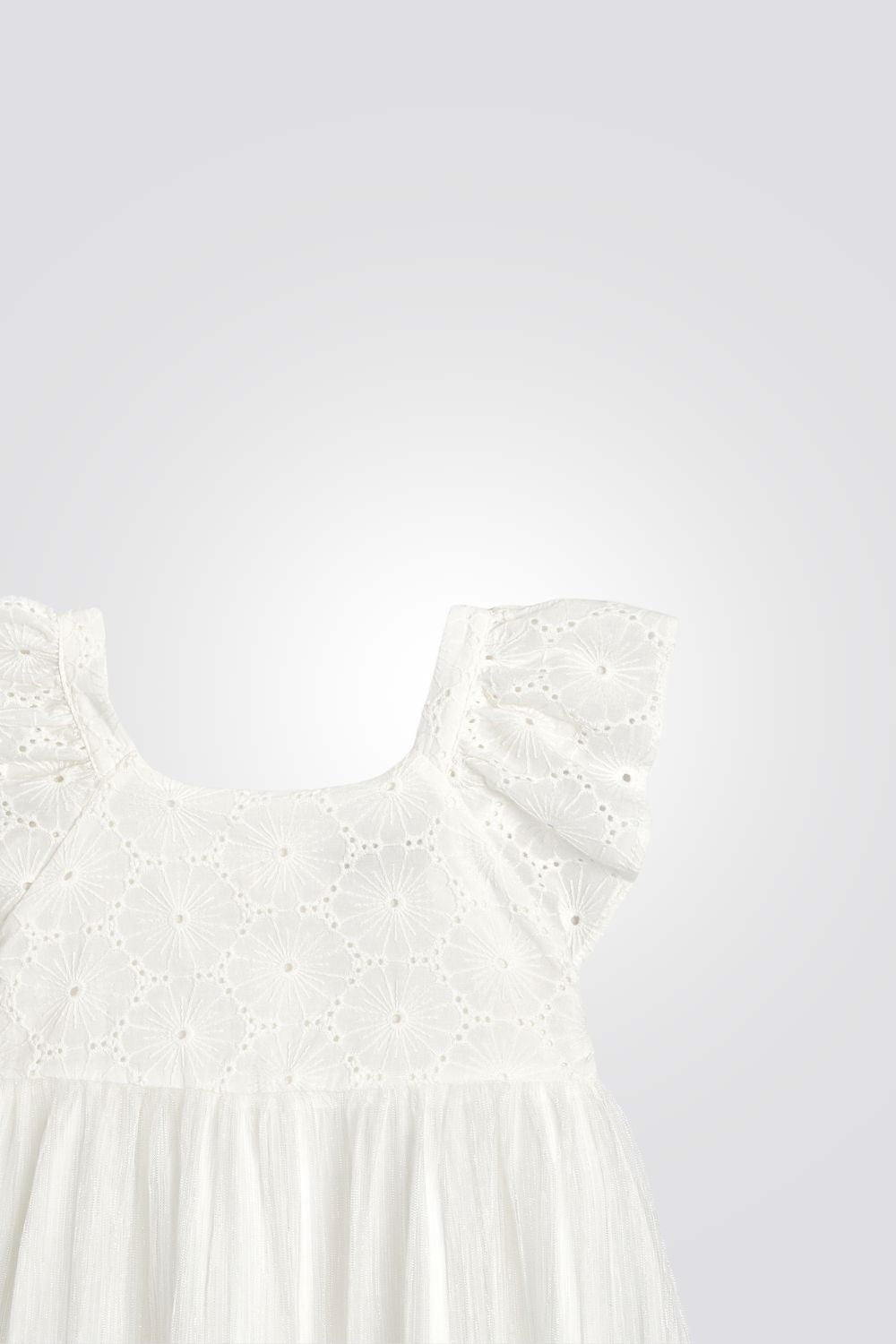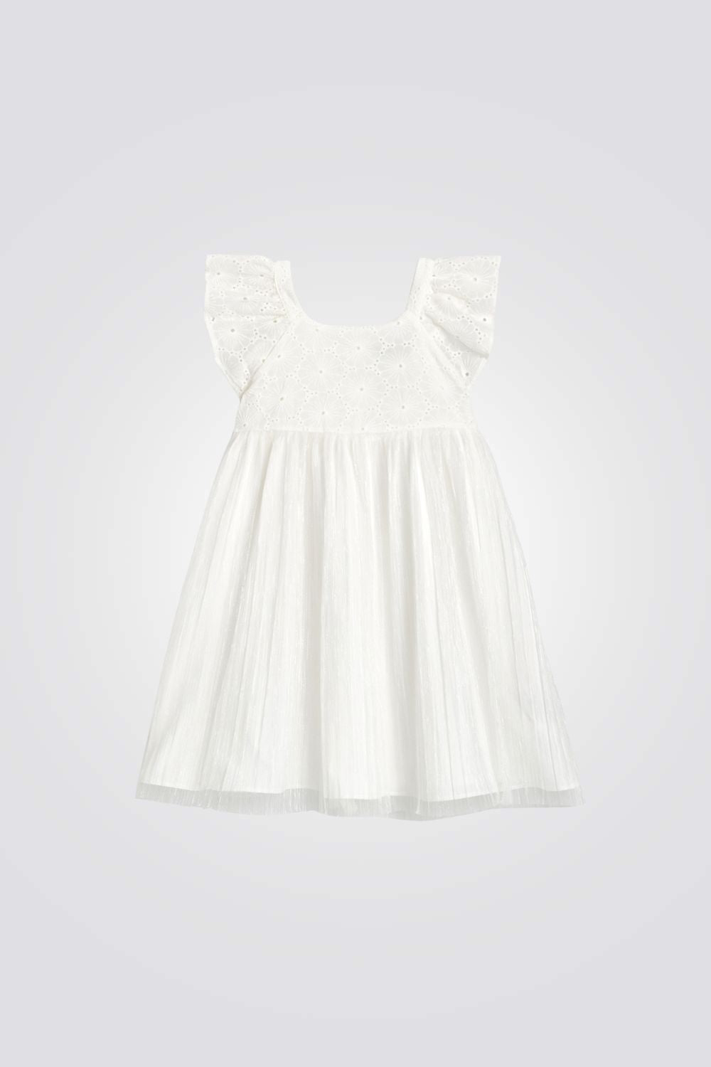 שמלה לילדות מבית המותג OKAIDI, בצבע לבן עם אפקט פנינה בגזרה מתרחבת וצווארון עגול , ושרוולים קצרים עם מלמלה.