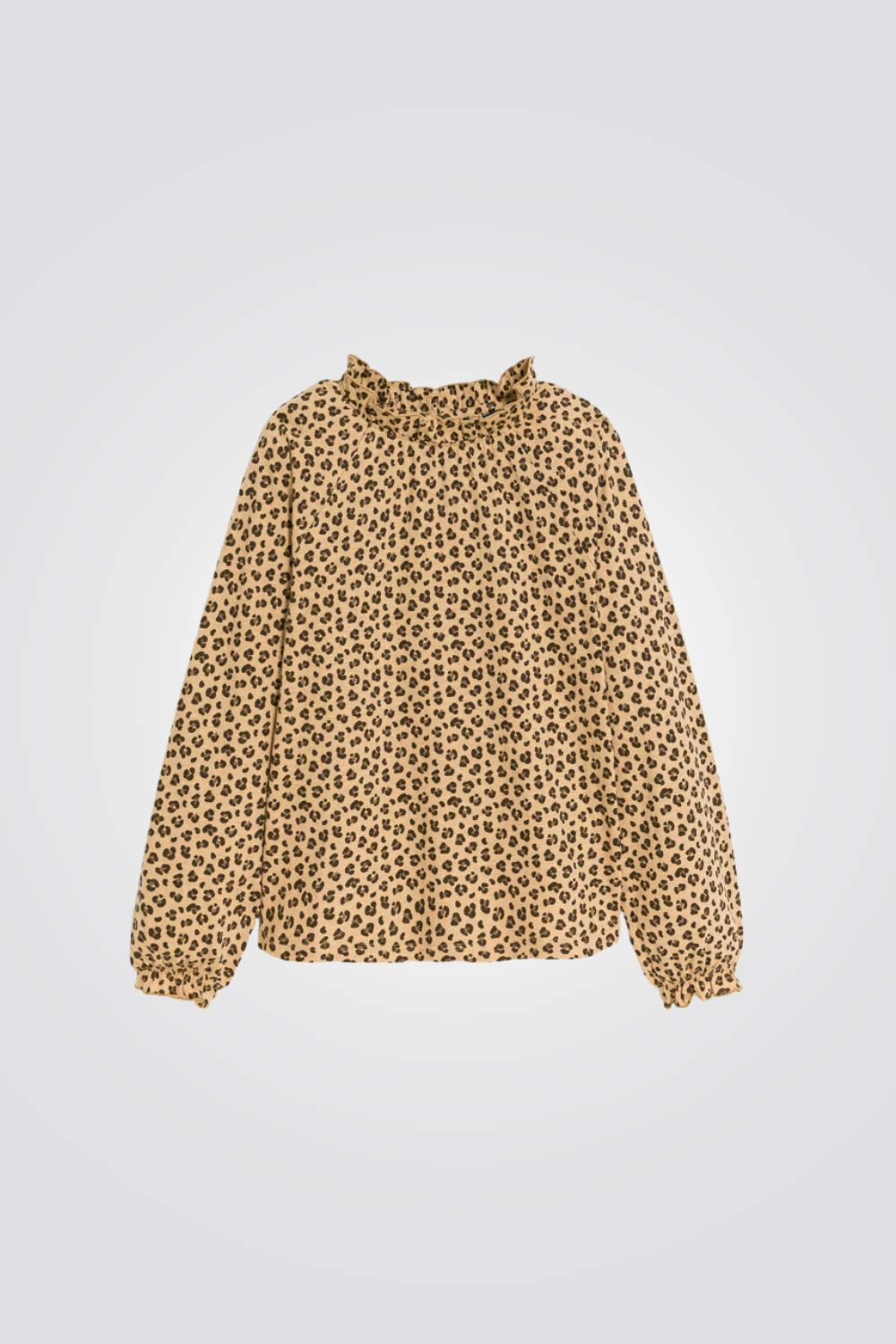 חולצה ארוכה לילדות מבית המותג OKAIDI, עם הדפס מנומר, צווארון עגול וגבוהה עם מלמלה , ושרוולים ארוכים עם סיומת גומי.