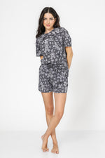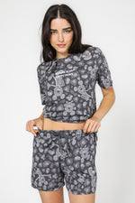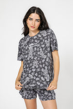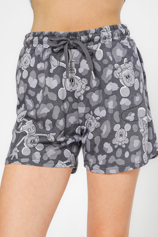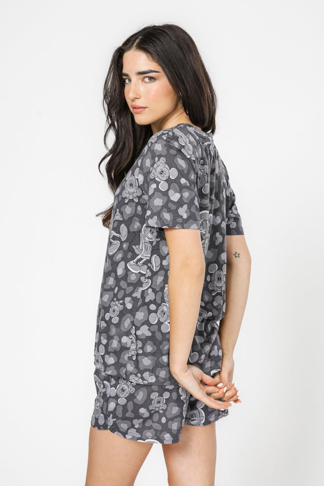 סט פיג’מה אפורה מבד סינגל ג’רסי קליל ונעים בהדפסים של מיקי מאוס בסגנון מנומר. חולצה עם מפתח צוואר עגול ושרוולים קצרים ומכנסיים קצרים תואמים עם כיסים.
