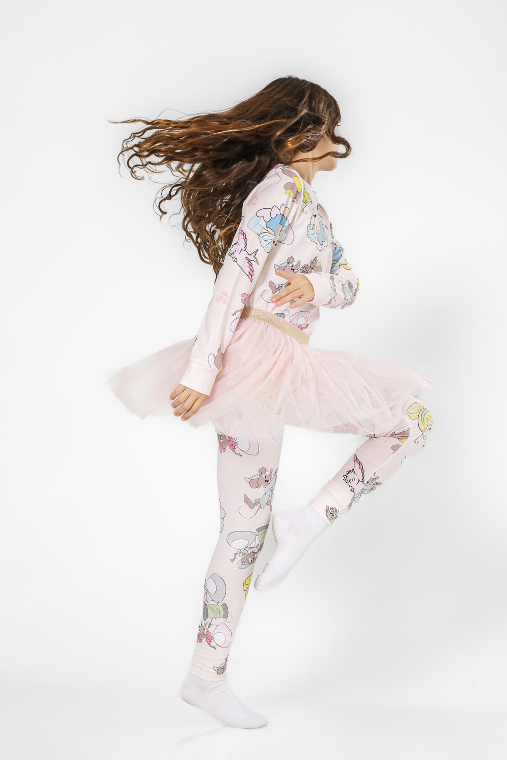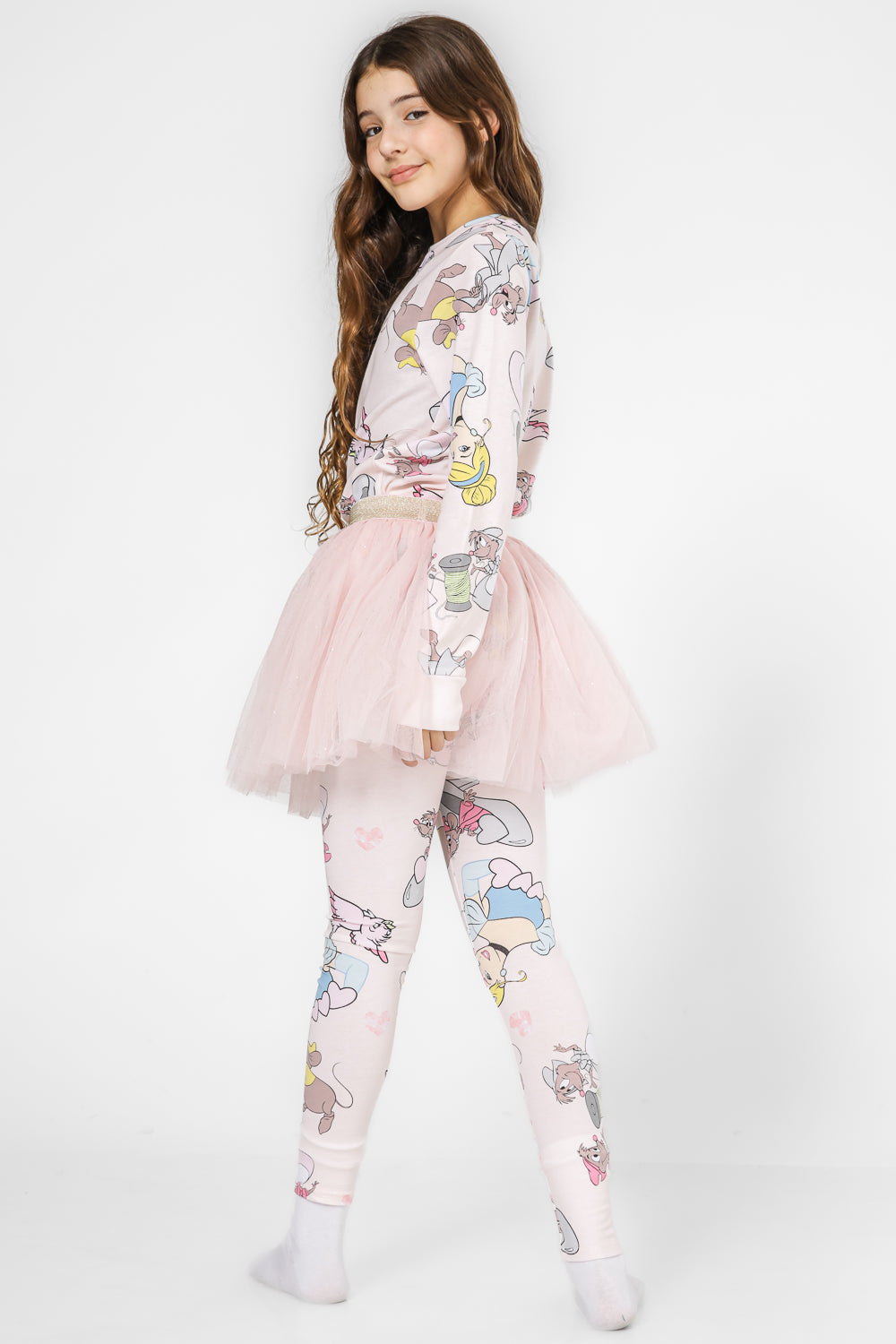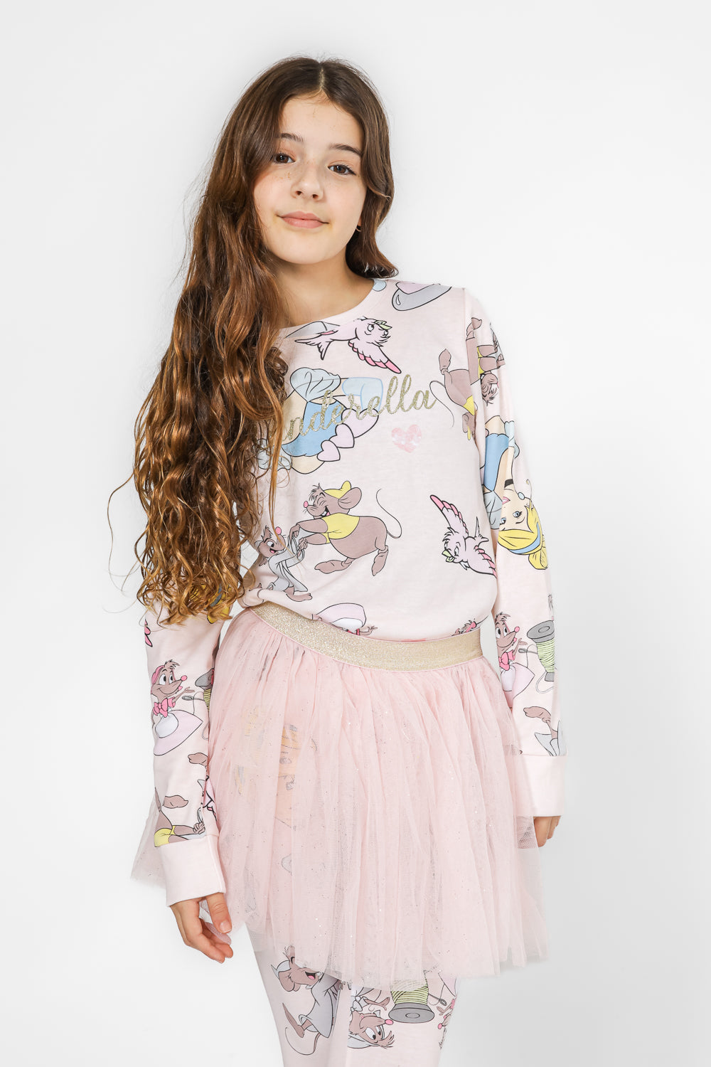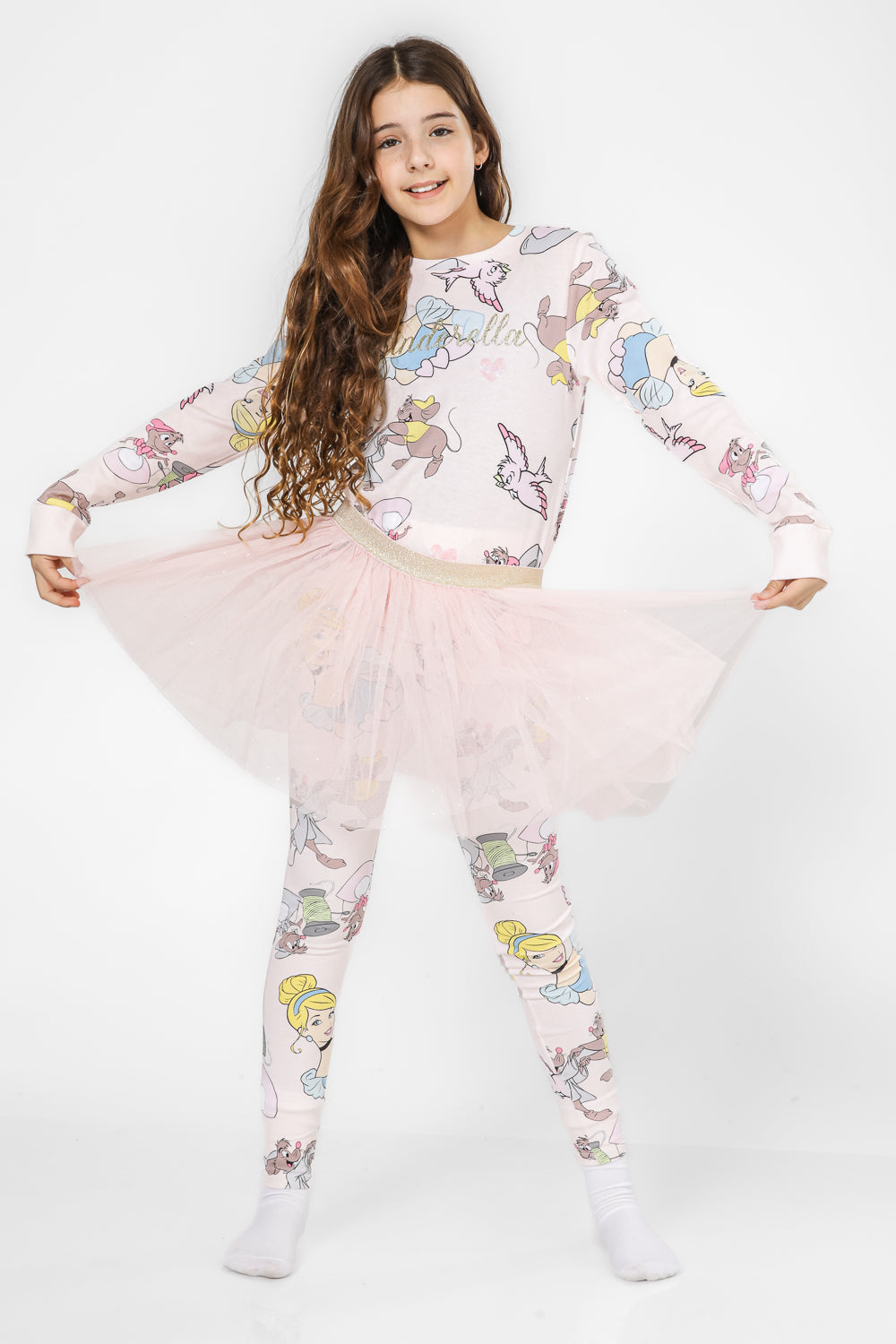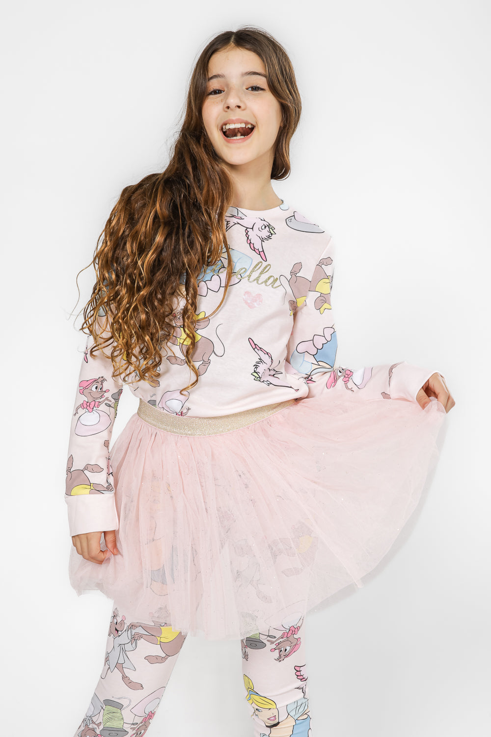 סט מבד אינטרלוק קליל ונעים בהדפס נסיכת דיסני. חולצה עם שרוולים ארוכים עם סיומת מנג’ט וצווארון עגול ומכנסיים ארוכים עם חצאית טול קטנה נפרדת עם אורות.