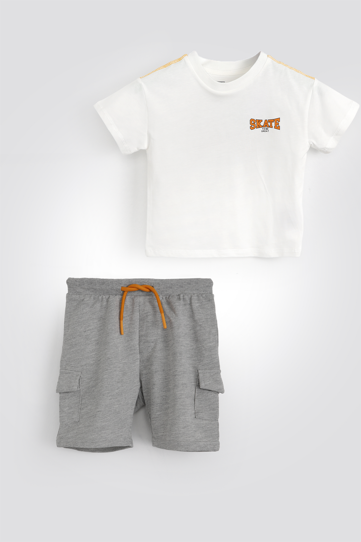 סט חליפת גן קצרה מבית המותג DELTA העשויה מבד קליל ונעים, במוטיב סקייטבורד. חולצה עם שרוולים קצרים וצווארון עגול ומכנסיים קצרים תואמים עם גומי במותניים, שרוכי קשירה וכיסי דגמ”ח בצדדים.