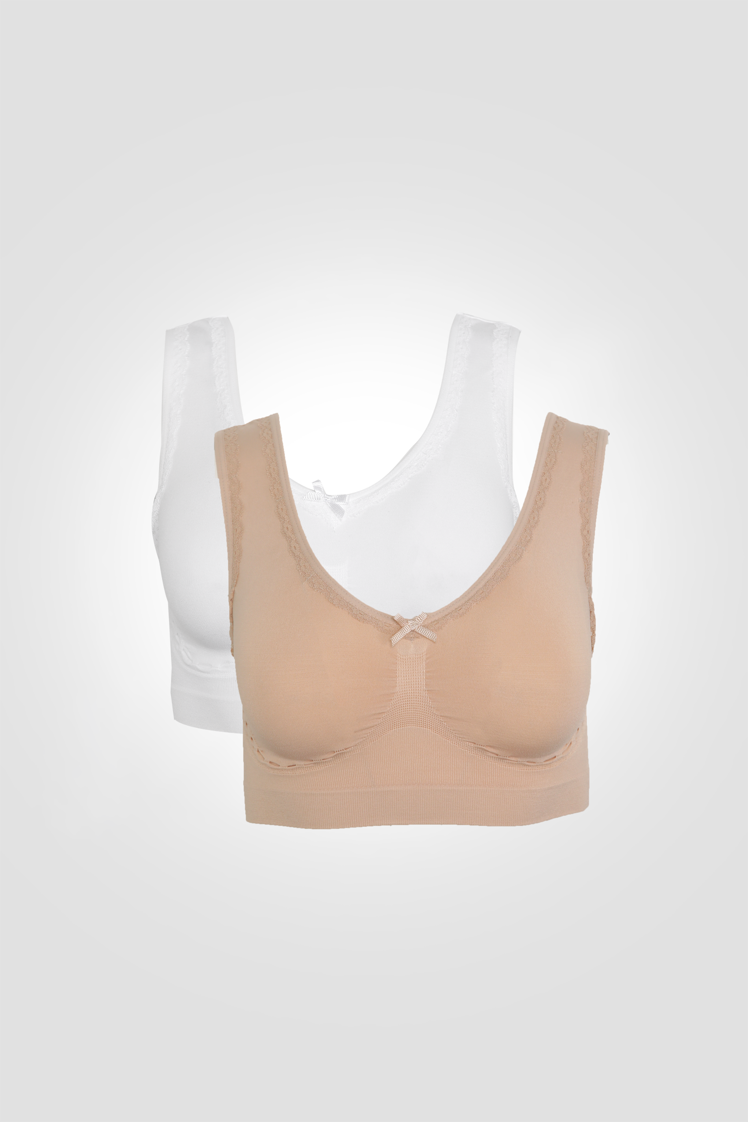 מארז זוג חזיות נוחות עם תחרה בצבעים לבן וניוד, בטכנולוגיית סריגה ייעודית וייחודית במקום עצם, לתמיכה מלאה המתאימה עצמה לגוף באופן מושלם ללא הפעלת לחץ מיותר.