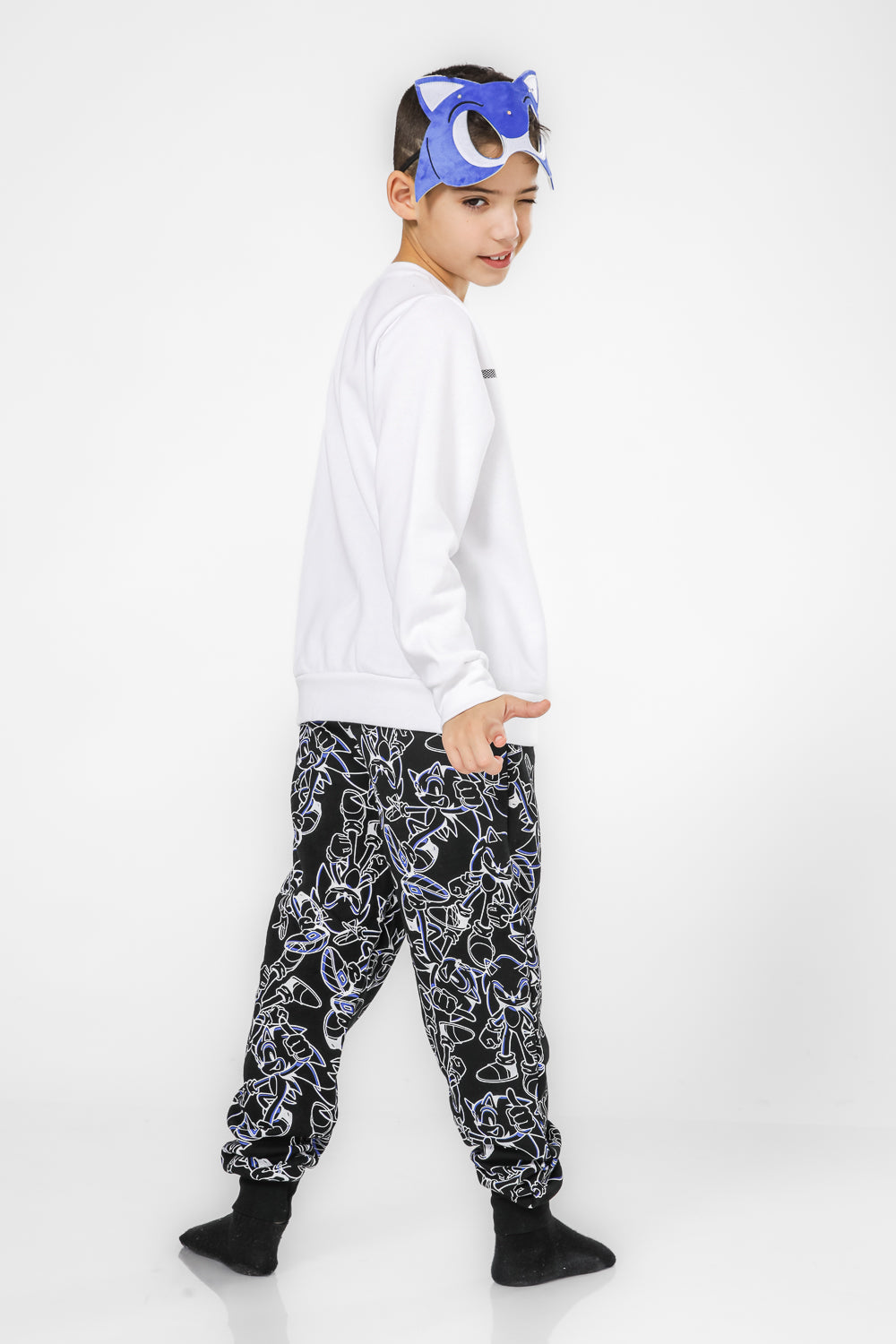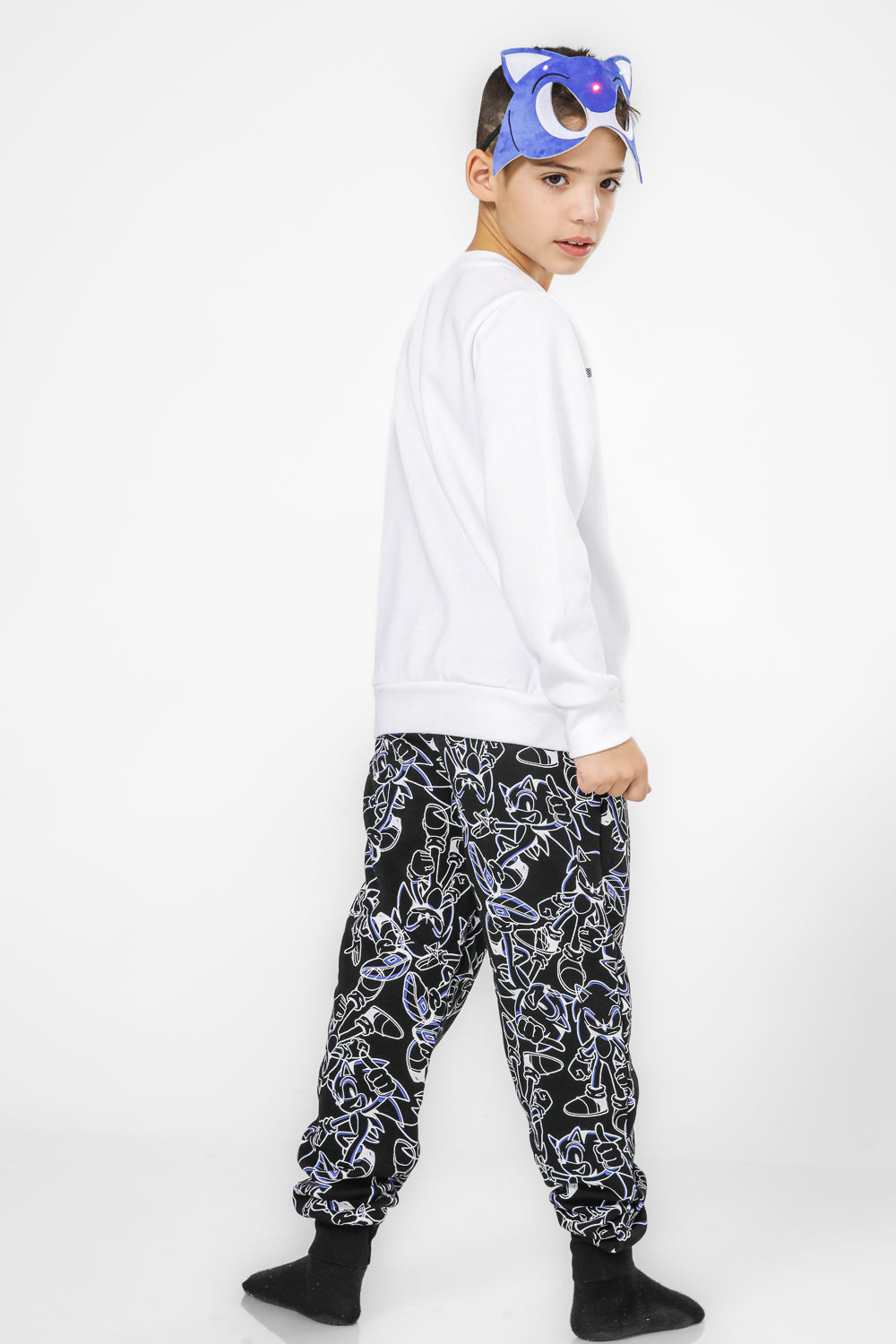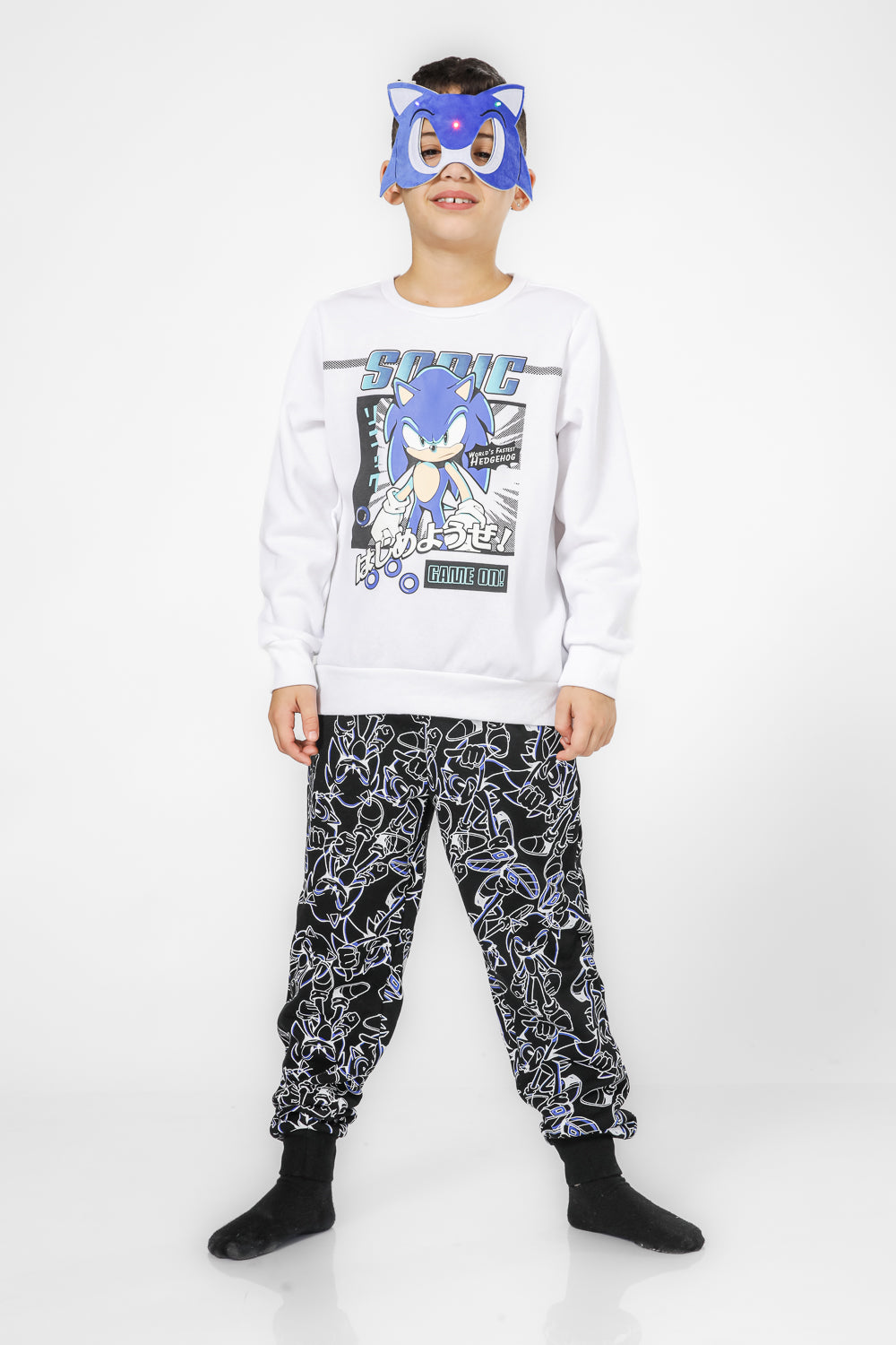 סט פיג’מה מבד פוטר רך ונעים במוטיב סוניק. חולצה עם צווארון עגול, שרוולים ארוכים בסיומת מנג’ט ומכנסיים ארוכים בסיומת מנג’ט.מגיע עם מסיכה עם אורות.