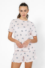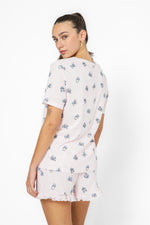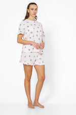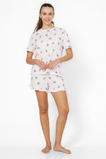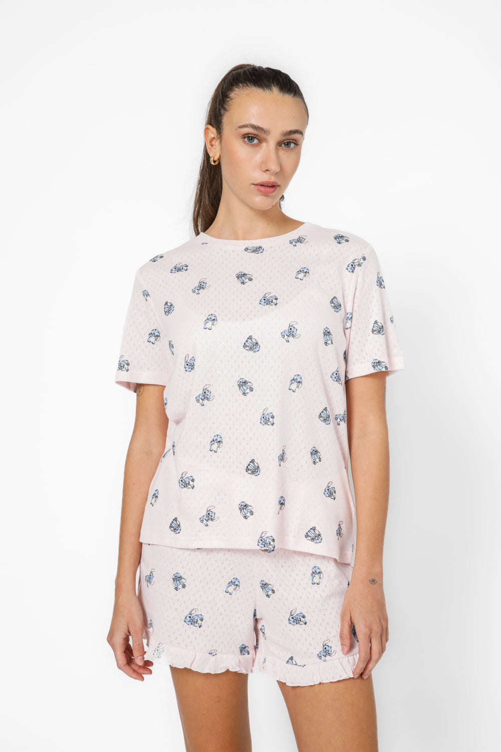 סט פיג'מה קצרה לנשים מבית המותג DELTA בטקסטורת פוינטל עדינה עם הדפס של סטיץ’. חולצה עם צווארון עגול ושרוולים קצרים, ומכנסיים קצרים עם גומי במותניים וסיומת מלמלה.