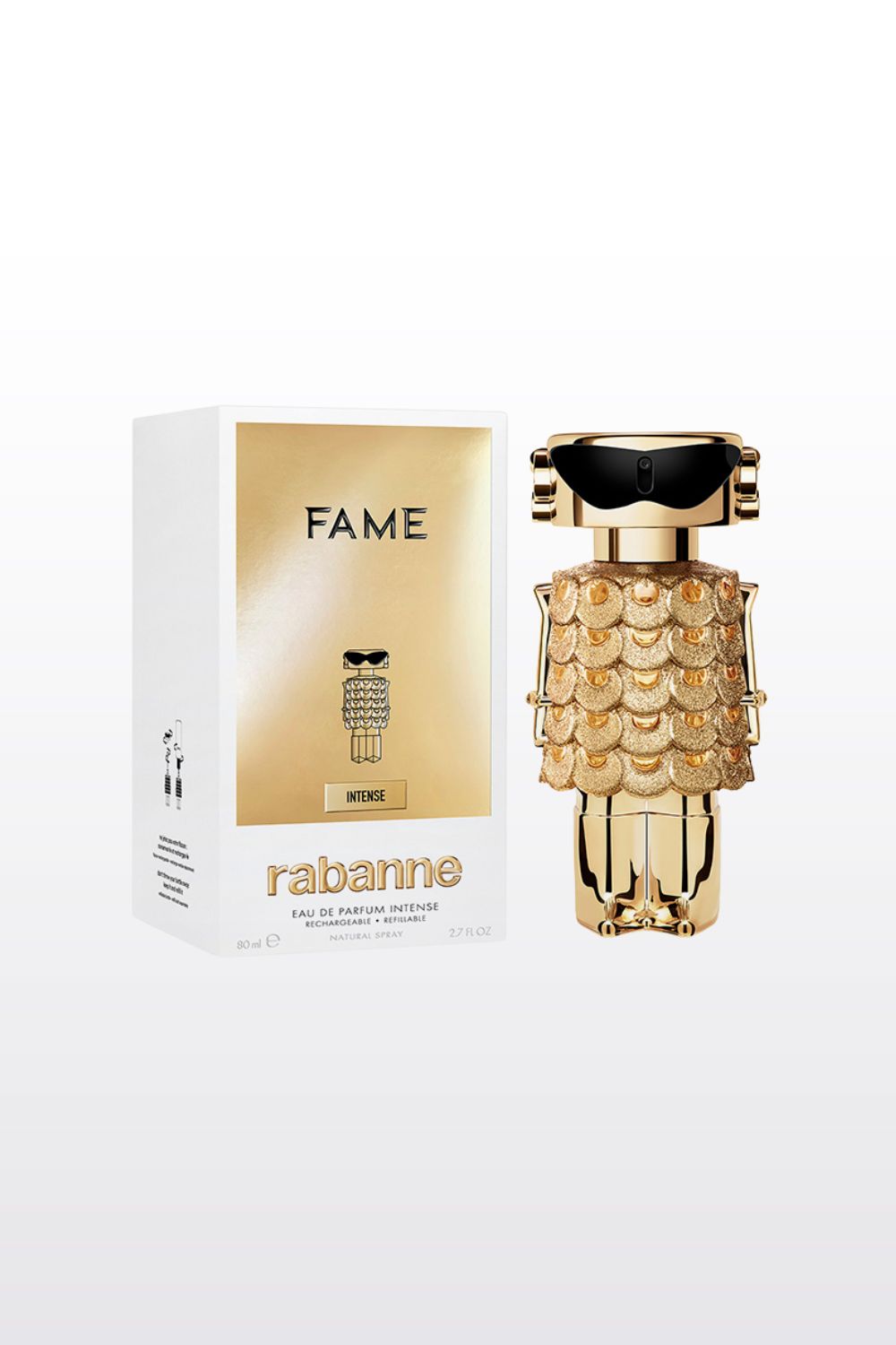 או דה פרפיום INTENSE מבית רבאן, בניחוח נועז ומנצנץ יותר מאי פעם. הניחוח פרחוני - עצי מושק בעל מרכיבים זהובים של ענבר חושני ויסמין סולארי המעניקים חמימות נימוחה,מכיל תווי קוקוס וקטורת, בהירות וטוהר נוצץ לחותמת הריח.88% מרכיבים ממקור טבעי . הבקבוק של FAME INTENSE בעיצוב שמלת זהב נוצצת הלוכדת את המוטיב המתכתי האגדי של אופנת רבאן. ניחוח ממכר למכורות לשיק פריזאי מודרני.