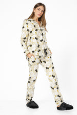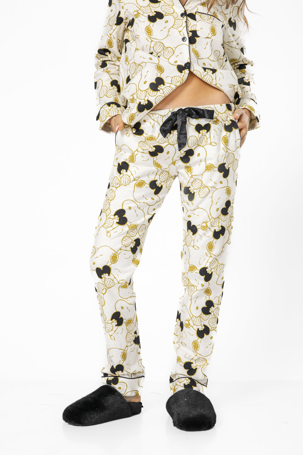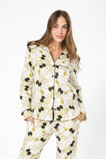פיג'מה מכופתרת מבית המותג BONITA DE MAS העשויה מבד רך ונעים במיוחד לעונת המעבר בעיצוב ייחודי ורענן של סנופי, חולצה מכופתרת עם צאוורון דש עם מכנסיים ארוכים תואמים עם שרוך קשירה.