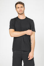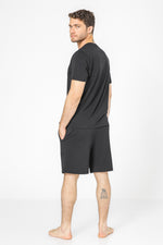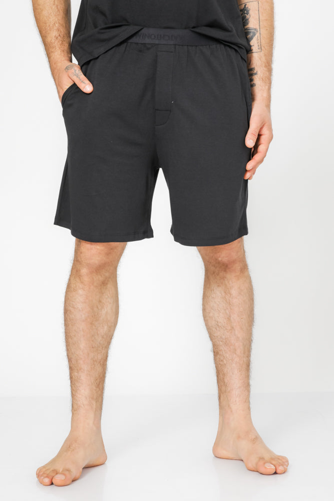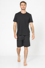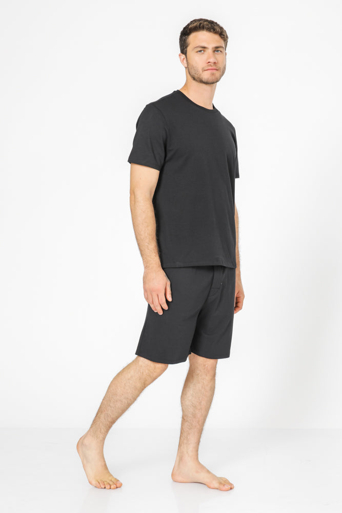 חולצה ומכנסיים מבד סופימה בשילוב בד מודל גמיש. חולצה קצרה עם צווארון עגול ומכנסיים קצרים תואמים עם גומי במותניים וכיסים בצדדים.