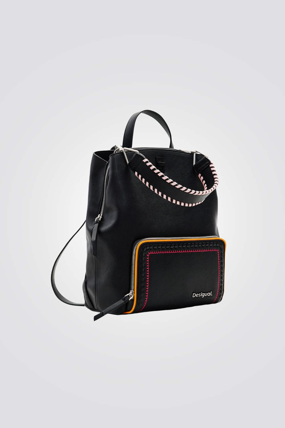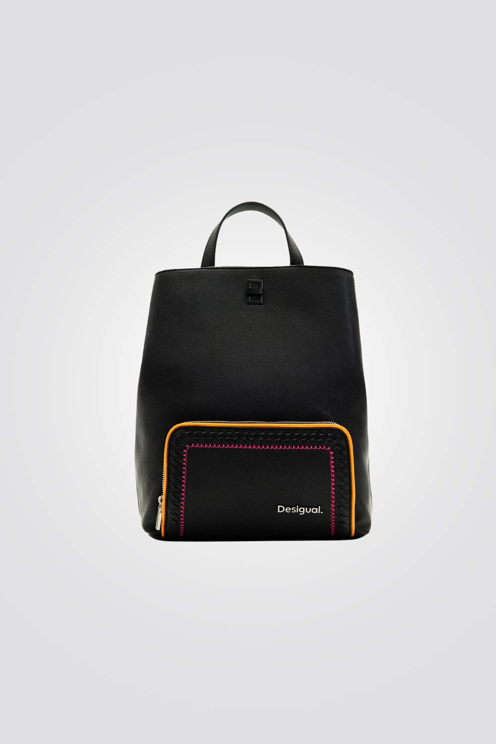 תיק גב לנשים מבית המותג DESIGUAL, בצבע שחור עם תא ראשי וסגירת רוכסן , ושני תאים חיצוניים וסגירת רוכסן.