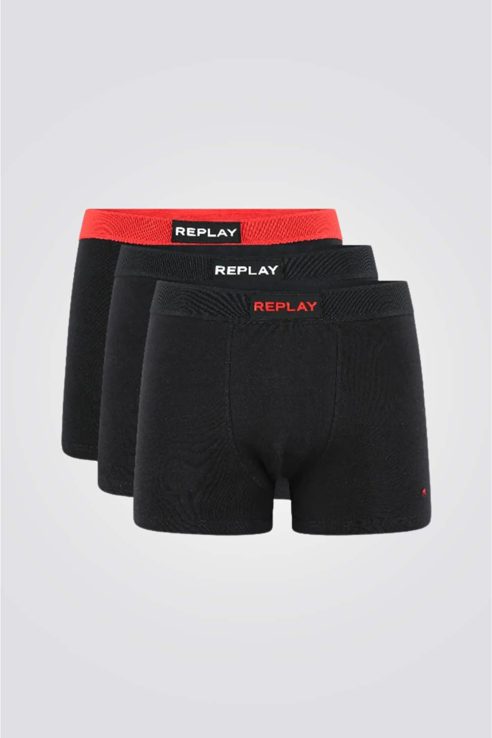 מארז תחתוני בוקסר לגבר מבית המותג REPLAY בצבע שחור ושילוב גומי אדום ושחור בקו המותניים.