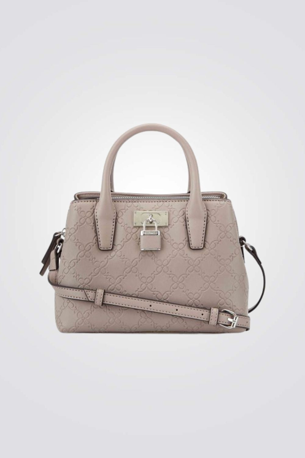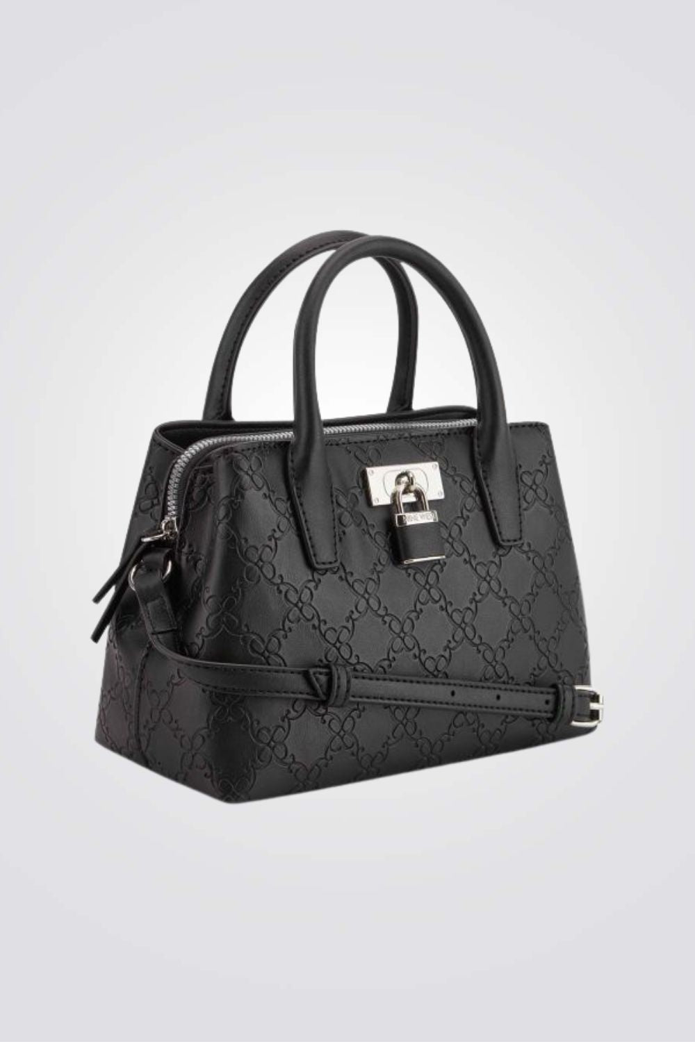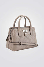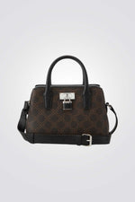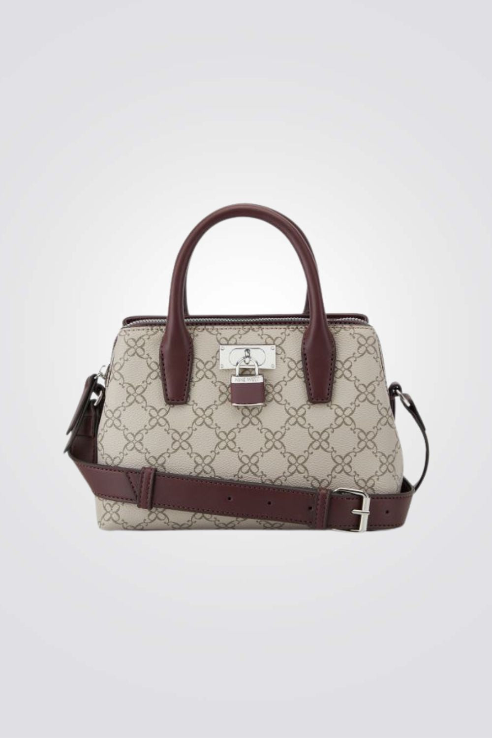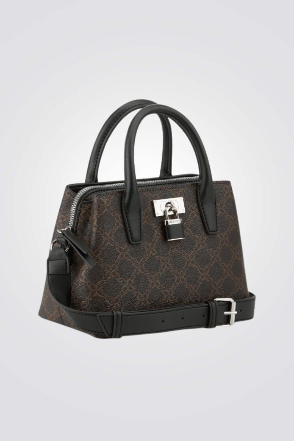 תיק צד אלגנטי לנשים מבית המותג NINE WEST עם פאטרן גאומטרי, גדול ונוח לאחסון. בעל רצועות נשיאה קצרות ורצועת נשיאה ארוכה מתכווננת, עם סוגר כסוף בשילוב מנעול מרשים ליופי.