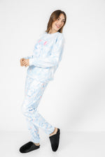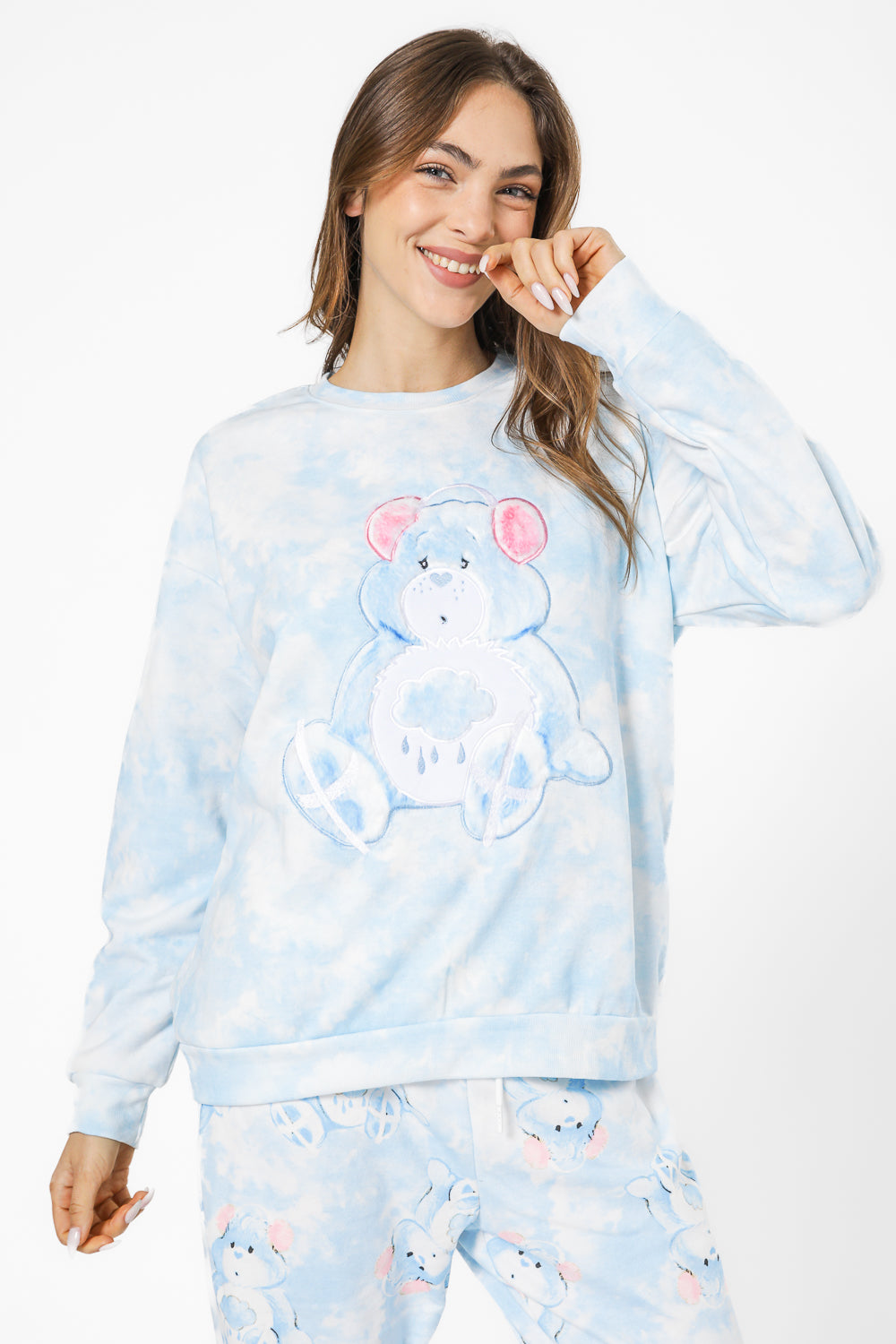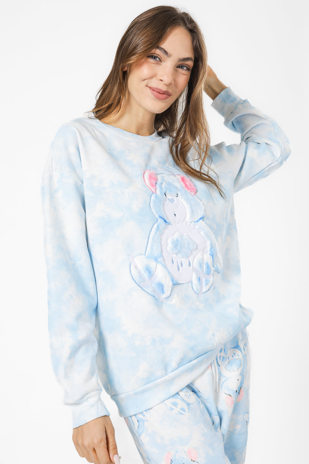 סט פיג'מה לנשים מבית המותג MEDIOGEN העשויה מבד פוטר רך ומחמם עם הדפס מתוק של דובוני איכפת לי. חולצה עם צווארון עגול ושרוולים ארוכים עם סיומת מנג’ט ומכנסיים ארוכים עם גומי במותניים.