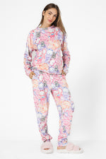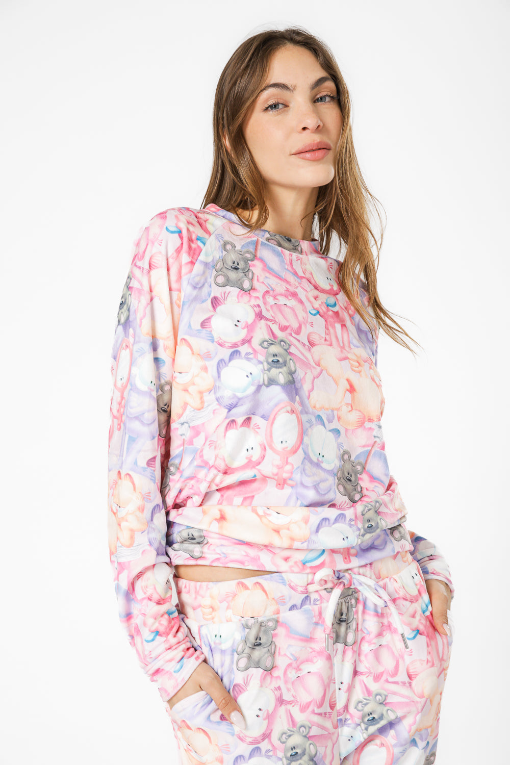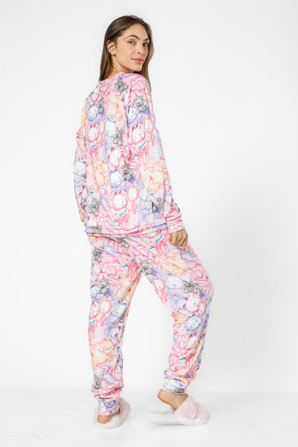 סט פיג'מה לנשים מבית המותג NICKELODEON העשוי מבד קטיפתי רך ומחמם עם הדפס תלת מימד של גארפילד. חולצה עם צווארון עגול ושרוולים ארוכים ומכנסיים ארוכים עם גומי במותניים וסיומת מנג’ט.