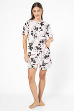 חולצה עם מפתח צוואר עגול ושרוולים קצרים ומכנסיים קצרים תואמים.