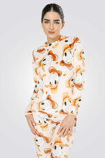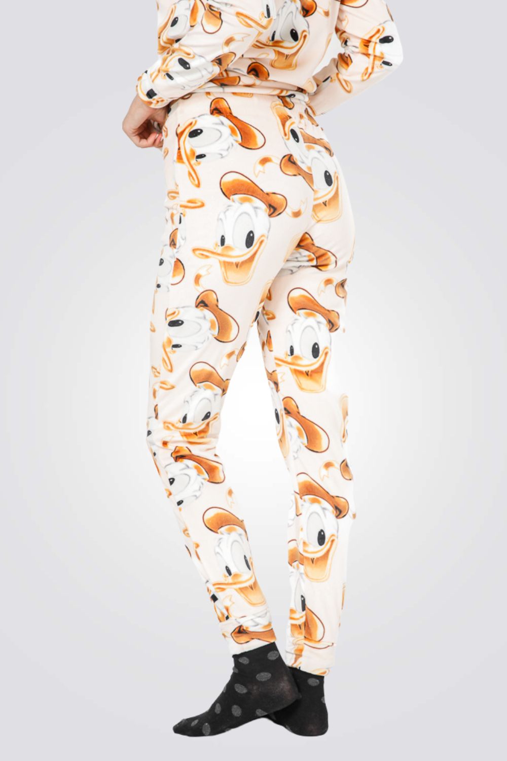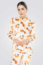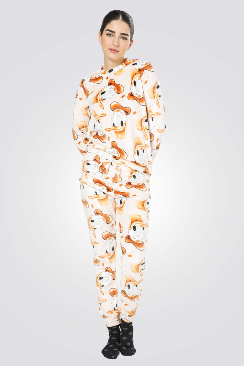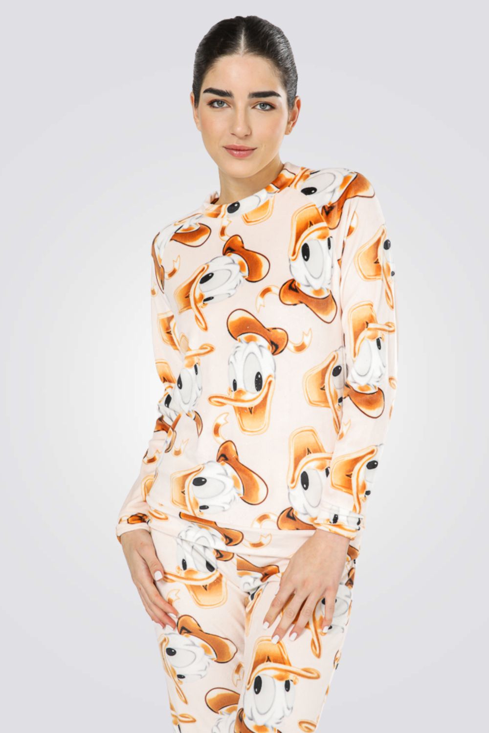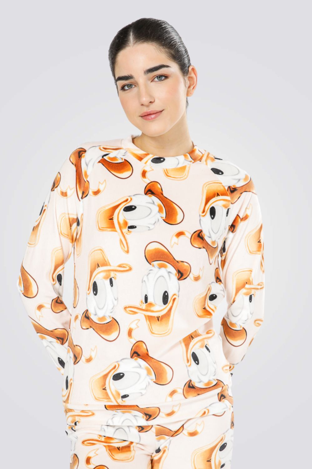 סט פיג’מה מבד קטיפה רך ומפנק בהדפס תלת מימד של דונלד דאק. חולצה עם צווארון עגול ושרוולים ארוכים בסיומת מנג’ט, מכנסיים ארוכים תואמים עם גומי במותניים ושרוכי קשירה.