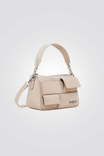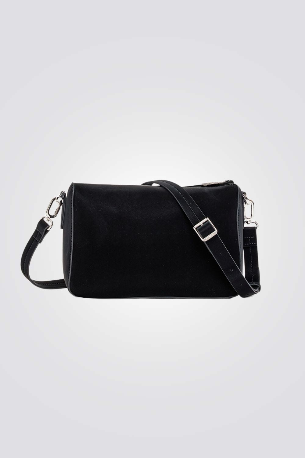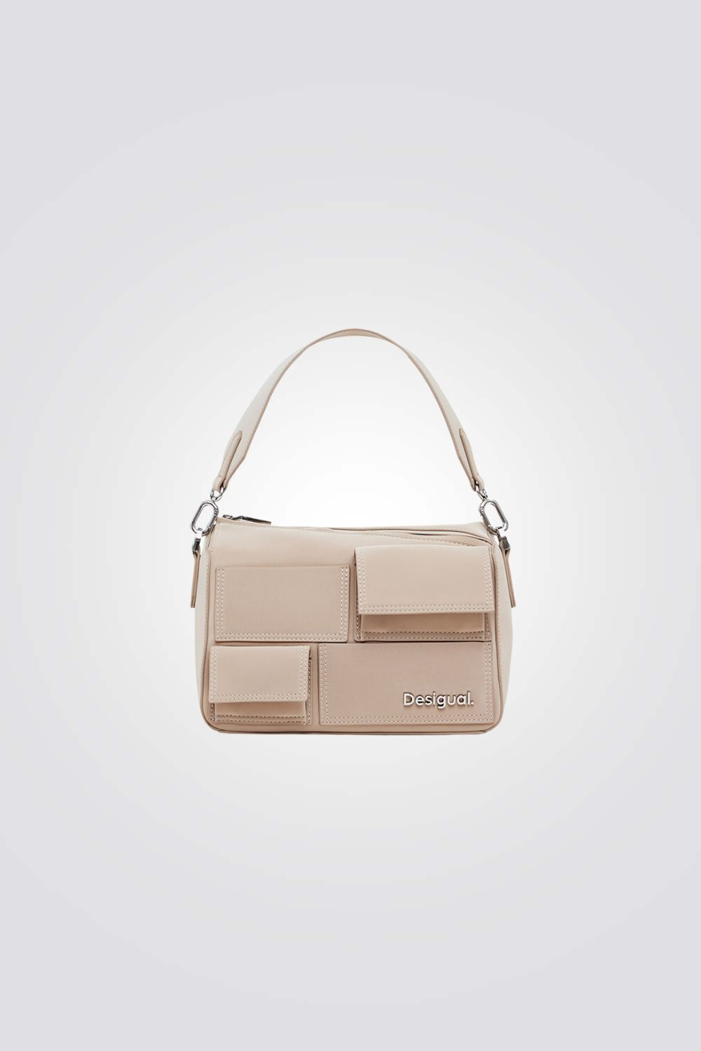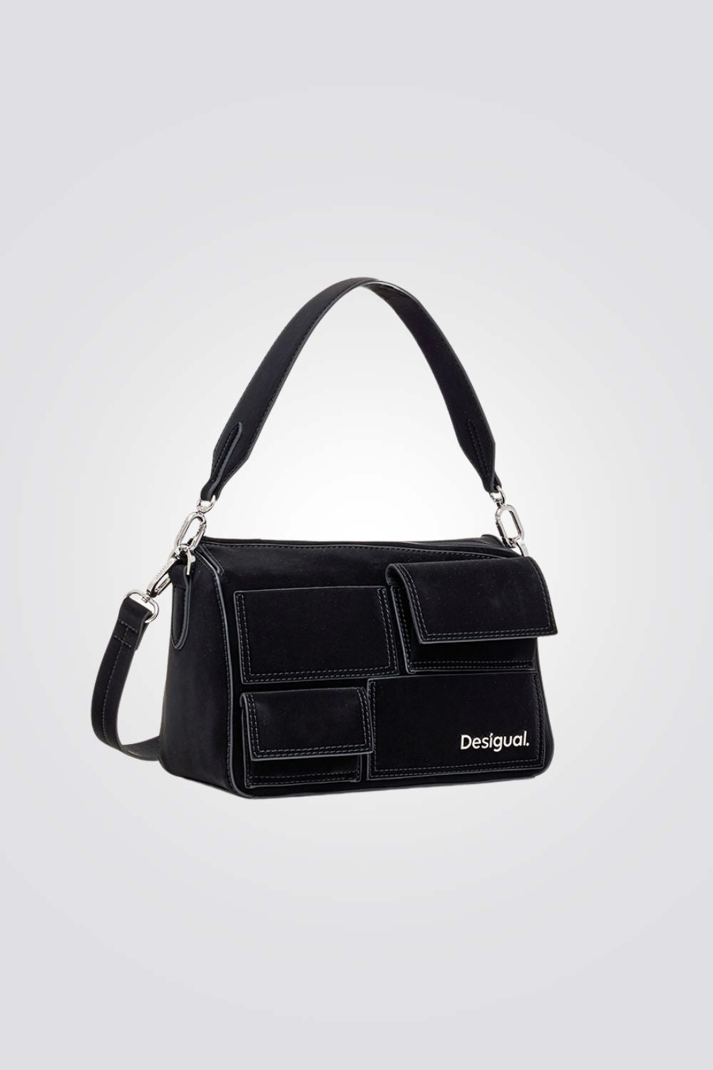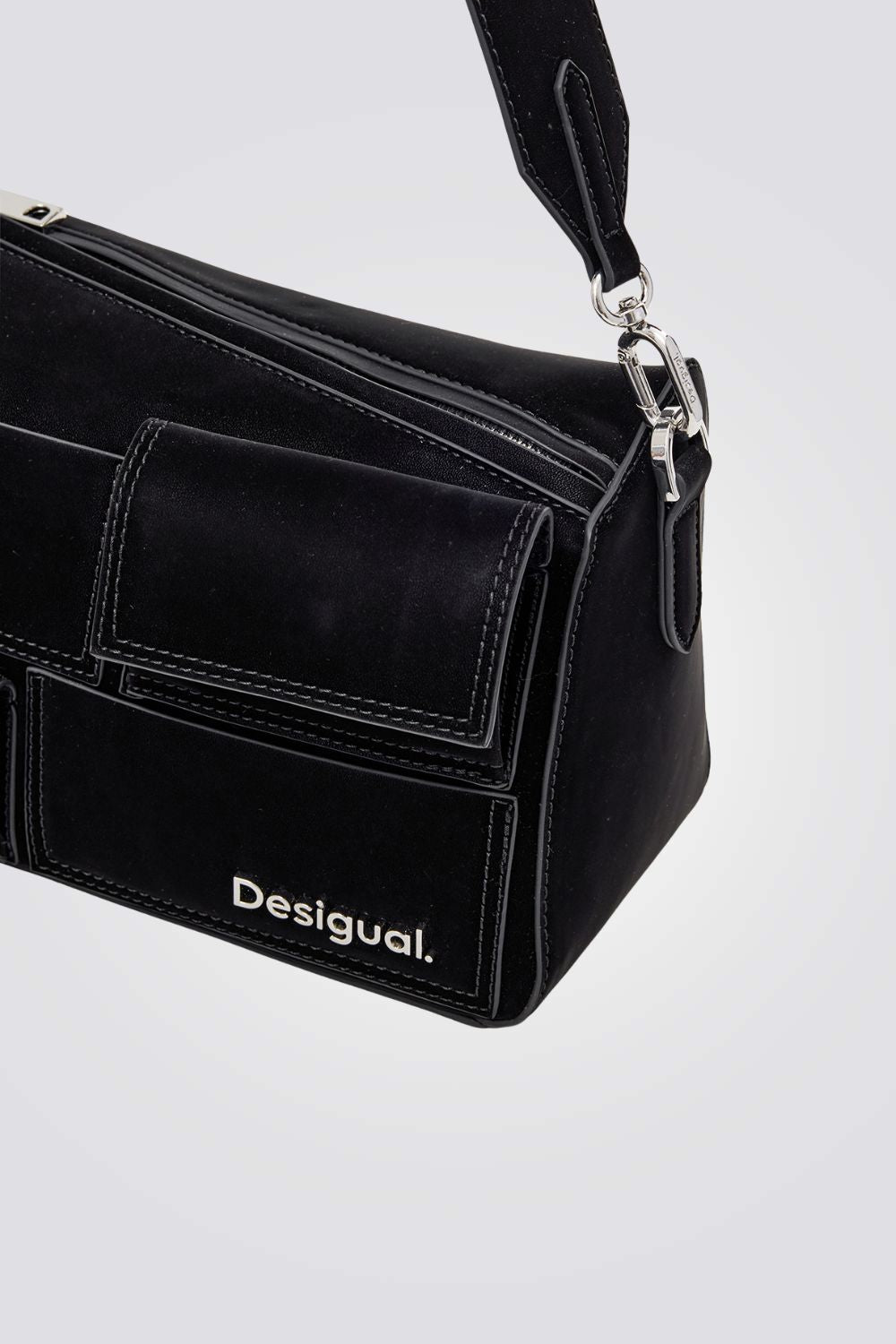 תיק יד לנשים מבית המותג DESIGUAL, בעיצוב מודרני, תא ראשי עם סגירת רוכסן ועוד תאים קטנים פנימיים וחיצוניים, רצועת יד קצרה ועוד רצועת צד ארוכה.