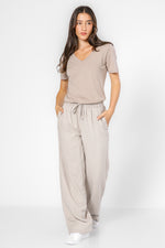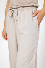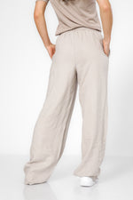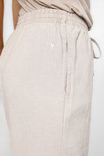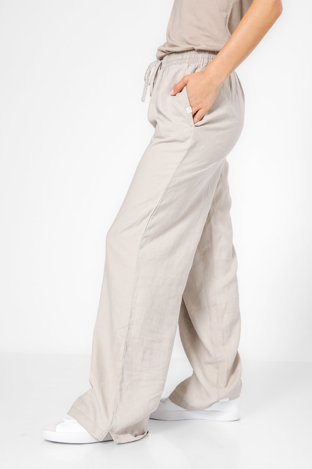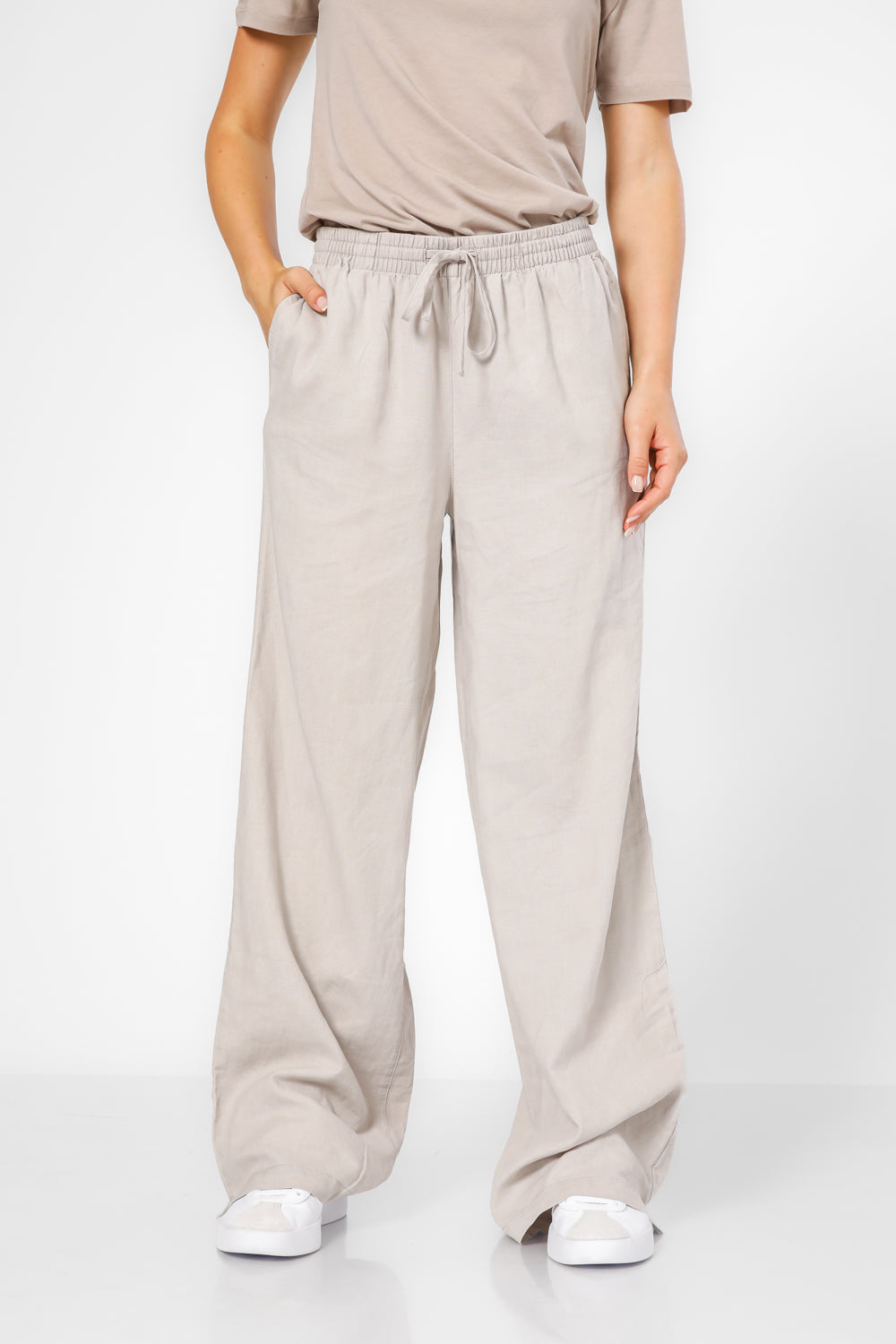 מכנסיים ארוכים בגזרה מתרחבת עשויים מבד בשילוב פשתן טבעי ונושם, עם גומי במותניים ושרוכי קשירה.