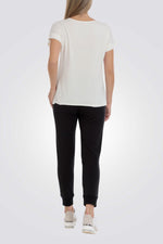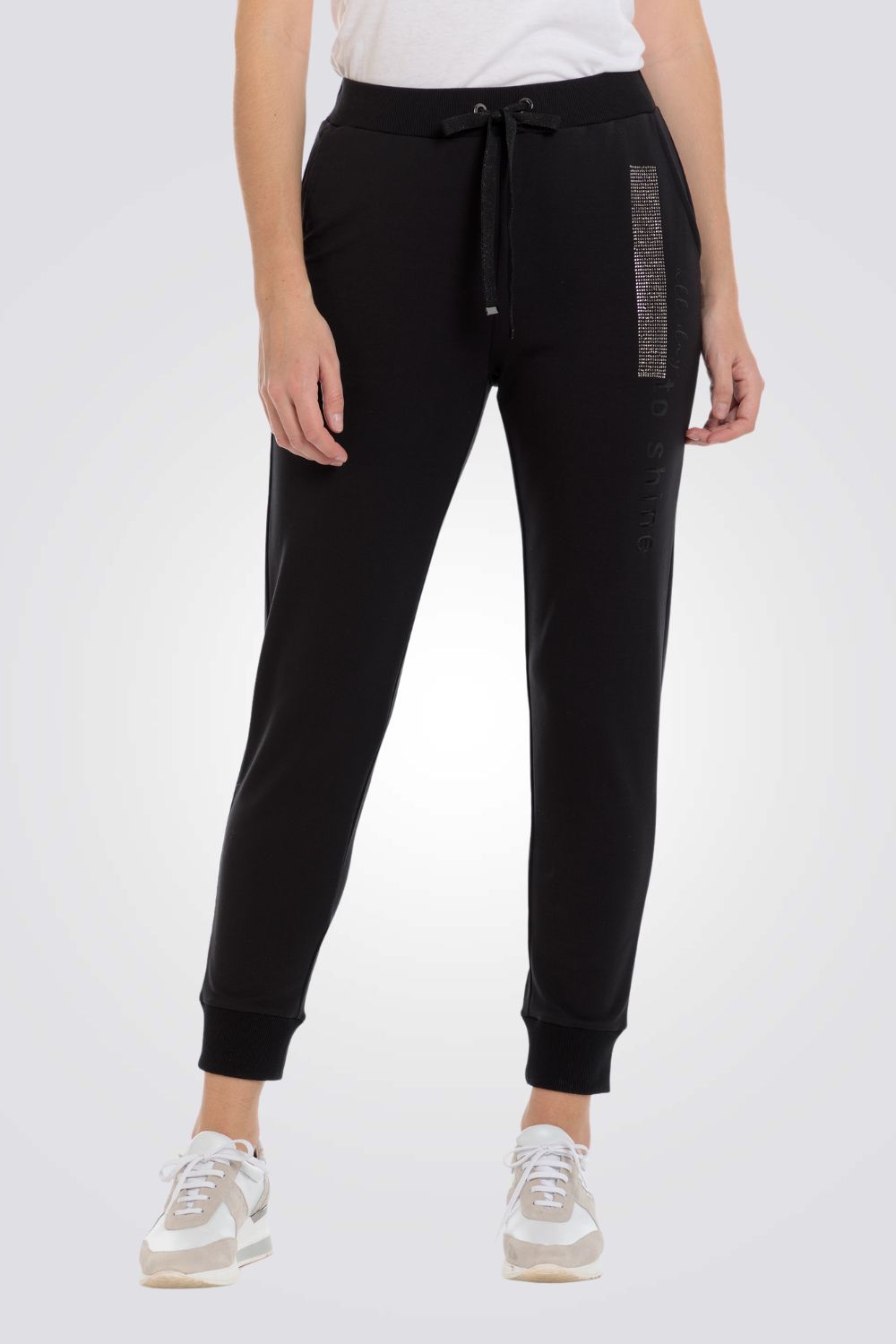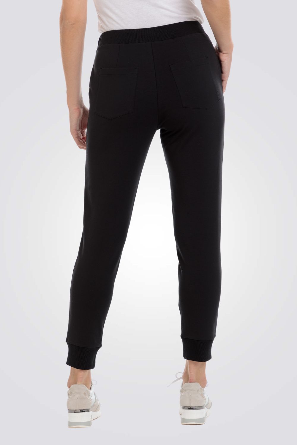 מכנסיים שחורים, ארבעה כיסים, מכפלת אלסטית, מותן אלסטית עם שרוך מתכוונן.