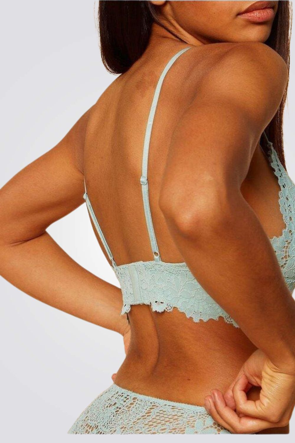 חזיית תחרה בדוגמה פרחונית מבית המותג ETAM בגוון טורקיז בהיר, קאפים בעיצוב משולשים במחשוף עמוק, בריפוד קל וללא ברזל, עם רצועה רחבה תומכת מתחת לחזה, כתפיות מתכווננות וסגירת קרסים אחורית.