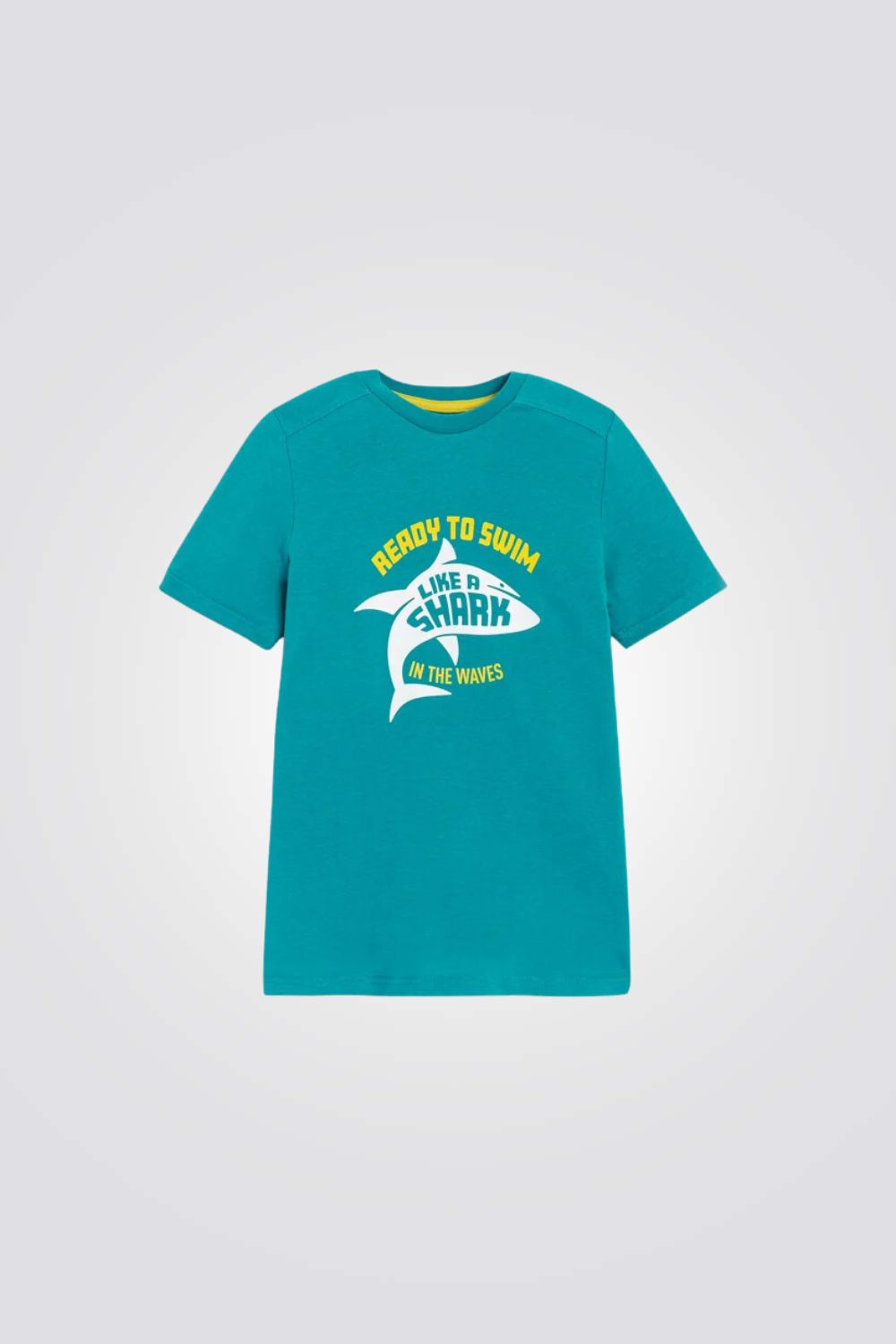 טישירט לילדים מבית המותג OKAIDI, בצבע טורקיז עם הדפס כריש בגזרה ישרה עם צווארון עגול ושרוולים קצרים.