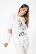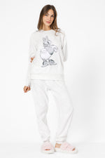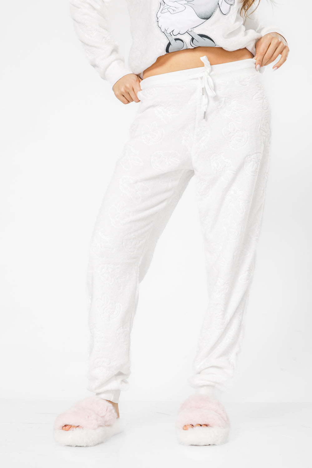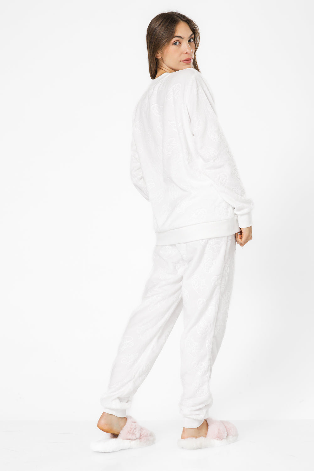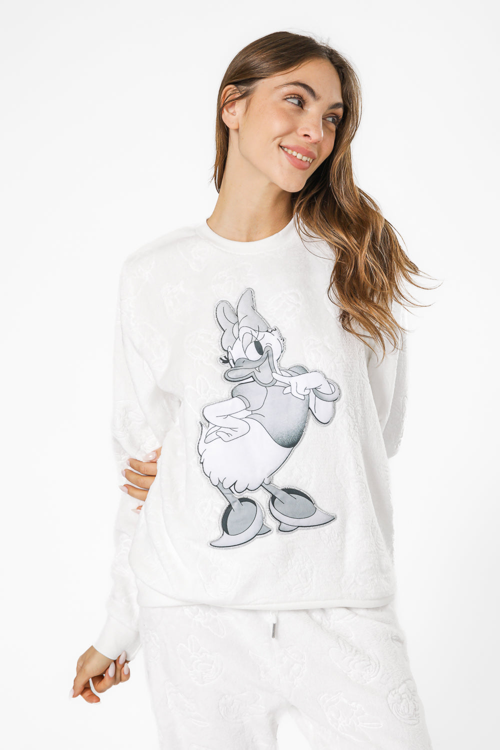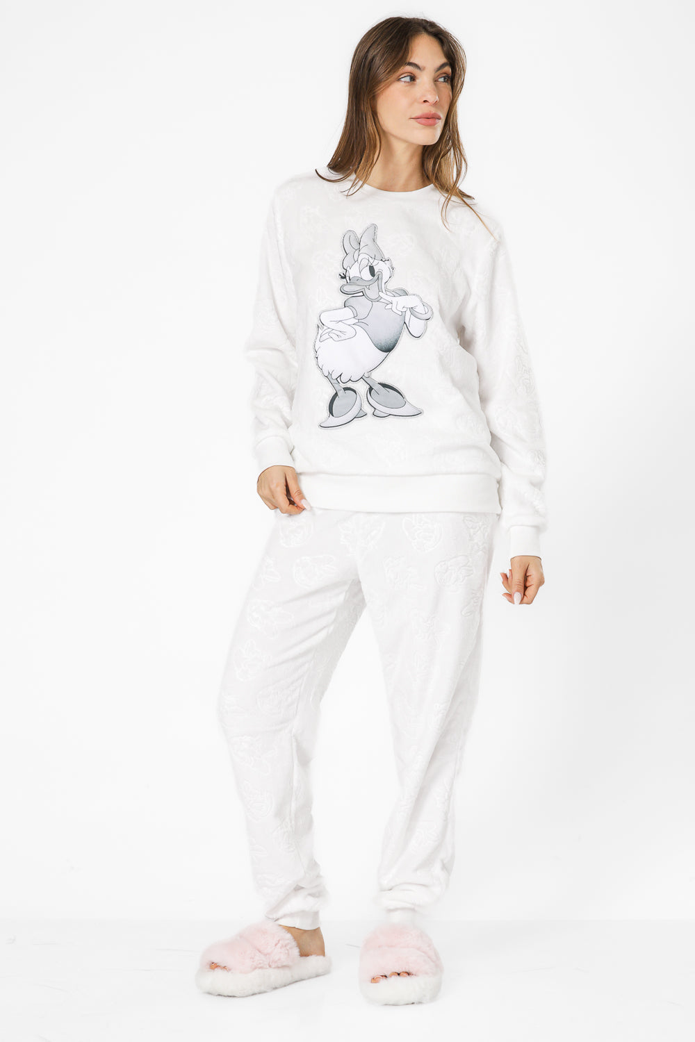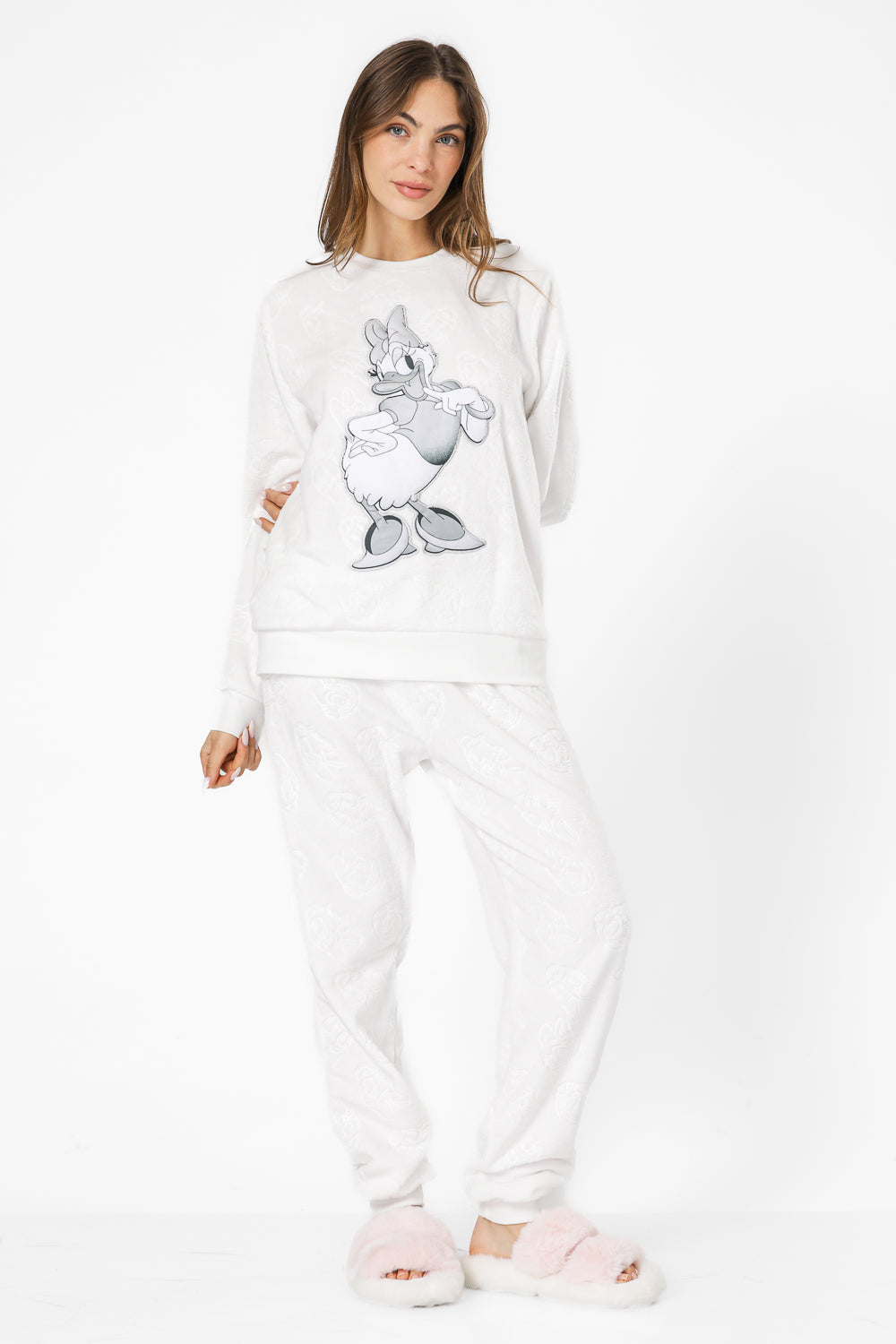 סט פיג'מה לנשים מבית המותג DELTA בצבע לבן עם הדפס של דייזי, בעל בד פליז רך ומחמם, חולצה ומכנסיים ארוכים בסיומת מנג'ט.