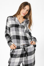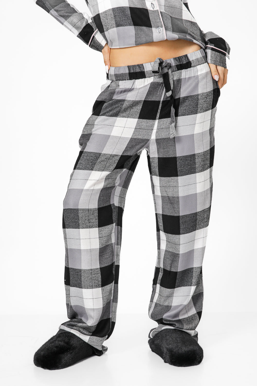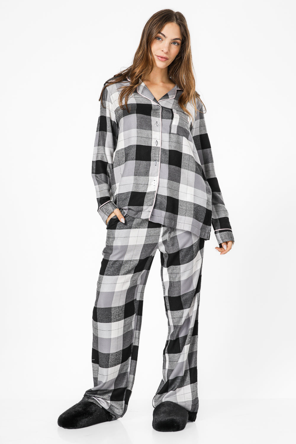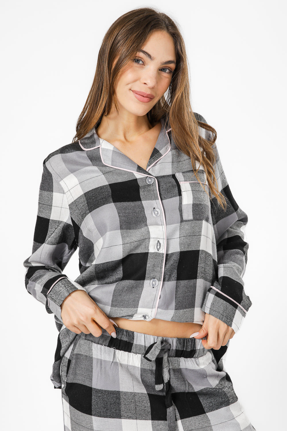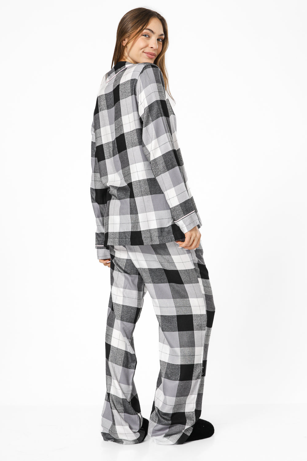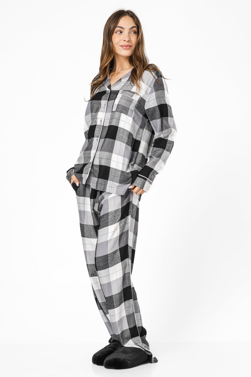 סט פיג'מה מכופתרת לנשים מבית המותג DELTA העשויה מבד מבד פלנל רך ומחמם במוטיב משבצות שחור לבן. חולצה מכופתרת עם צווארון משולשים ושרוולים ארוכים ומכנסיים ארוכים בגזרה ישרה עם גומי במותניים כיסים ושרוכי קשירה.