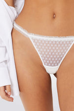 תחתוני חוטיני מבית המותג הצרפתי ETAM, עשויים תחרה עדינה בצבע לבן וטול בקו מותניים.