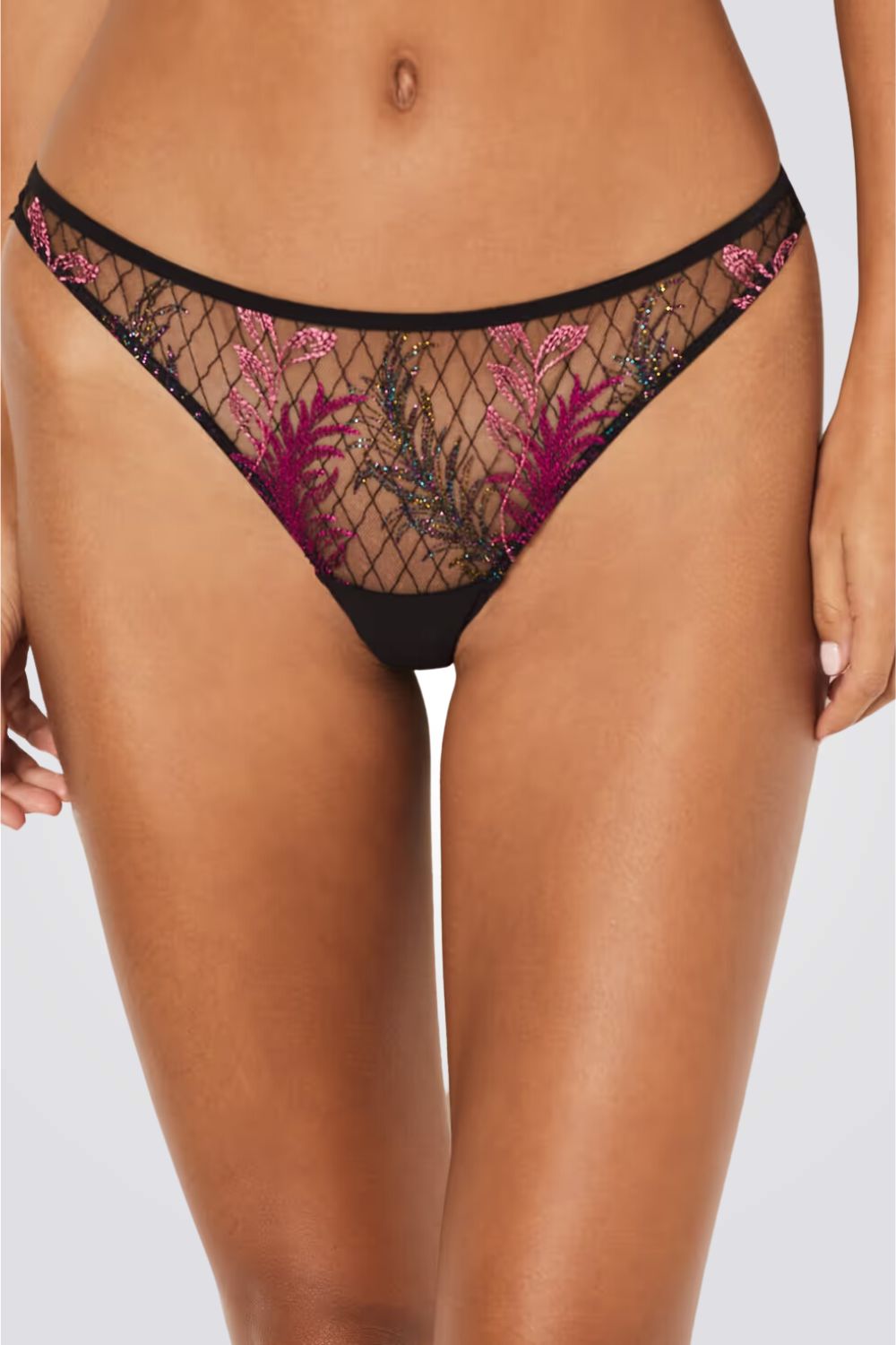 תחתוני טנגה מבית המותג הצרפתי ETAM העשויים בד תחרה מיוחד מעוטר ברקמה פרחונית צבעונית עם שרוכים קטנים דקורטיבים בחלקו האחורי.