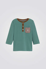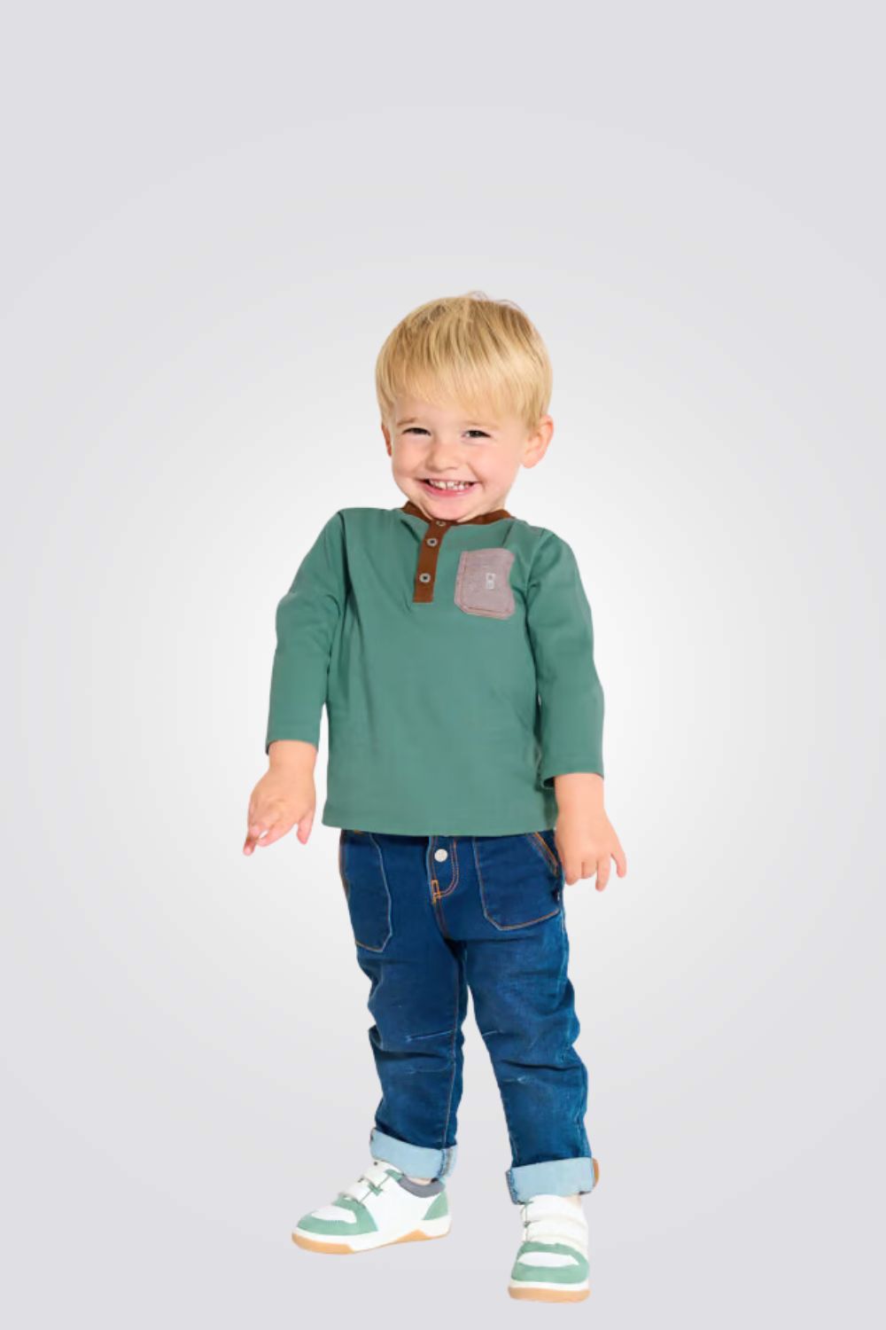 טישירט לתינוקות מבית המותג OBAIBI, בצבע ירוק עם שרוולים ארוכים צווארון עגול עם שלושה כפתורים וכיס בחזה.