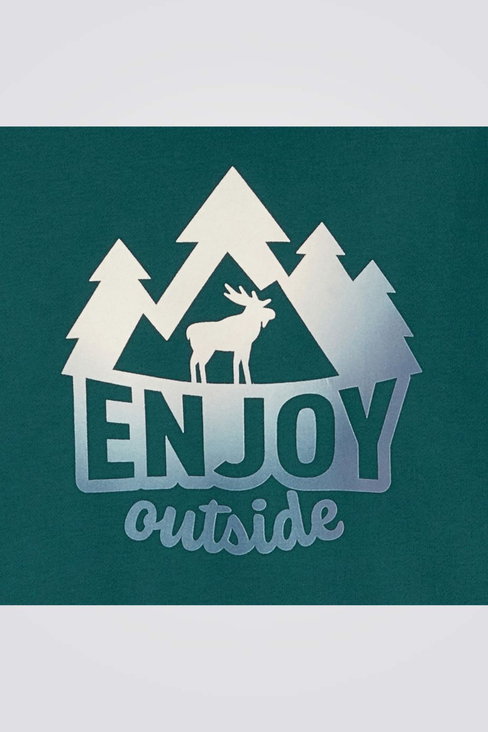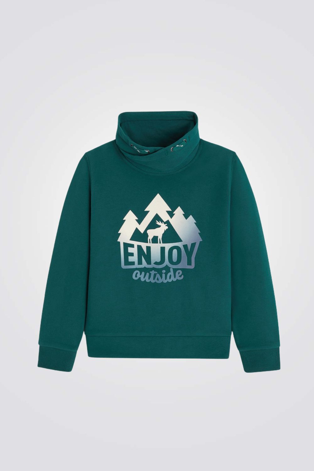 סווטשירט בנים בצבע ירוק מבית המותג OKAIDI עם צווארון מעטפת גבוה ומעוצב. הסווטשרט עם הדפס קדמי ENJOY .
