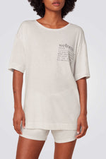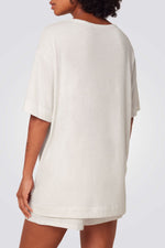 סט מורכב מחולצה ומכנסיים קצרים, הפיג'מה עשוי משילוב של בד כותנה וסיבי טנסל.