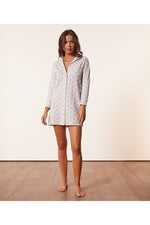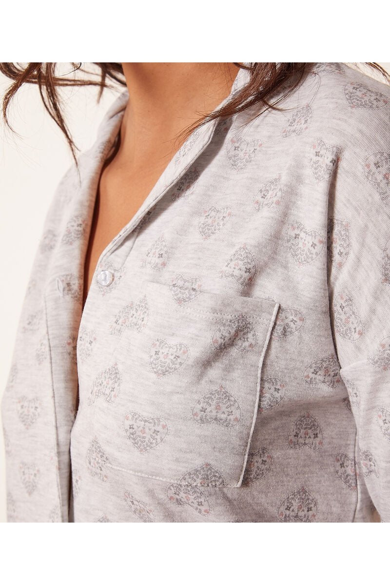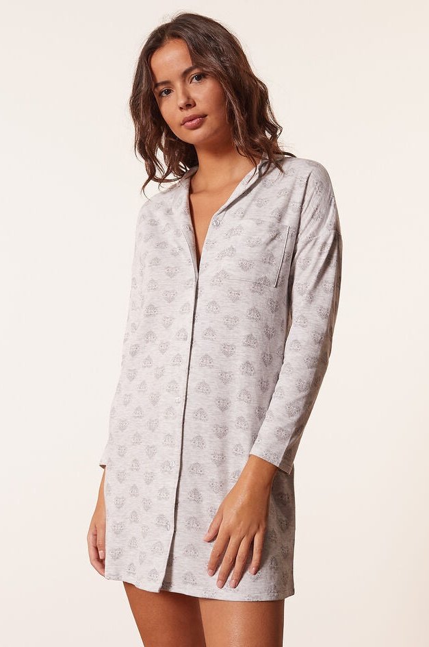 כותונת לילה מבית המותג ETAM בגוון אפור מלאנג' עם הדפס מוטיב לבבות, עשויה בד כותנה ג'רזי נעים במיוחד. הכותונת באורך הברך, עם שרוולים ארוכים, צווארון דש, כיס חזיתי וסגירת כפתורים קדמית.