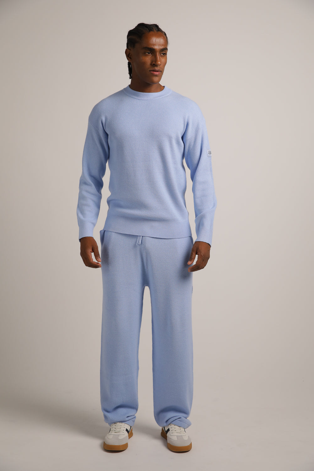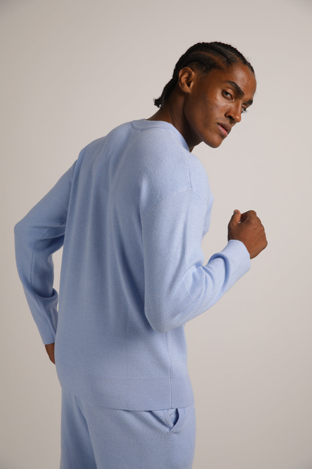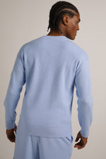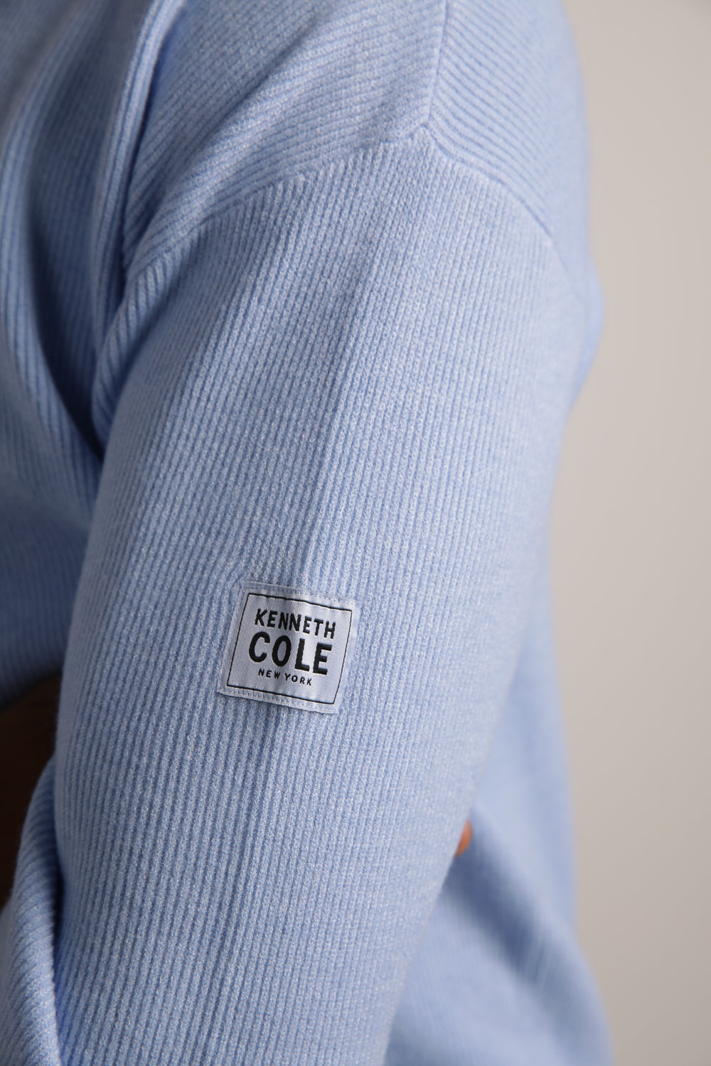 סווטשירט סריג מבית המותג KENNETH COLE לגברים בצבע תכלת, עשוי מבד ריב רך ונעים למגע, קליל ונוח ללבישה ביומיום, מכיל שרוולים ארוכים, צווארון גול ותגית עם לוגו המותג בצד ההשרוול.