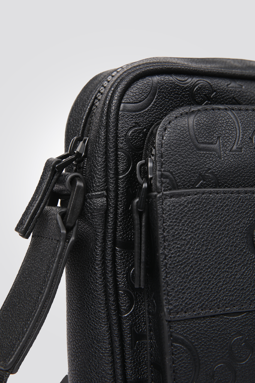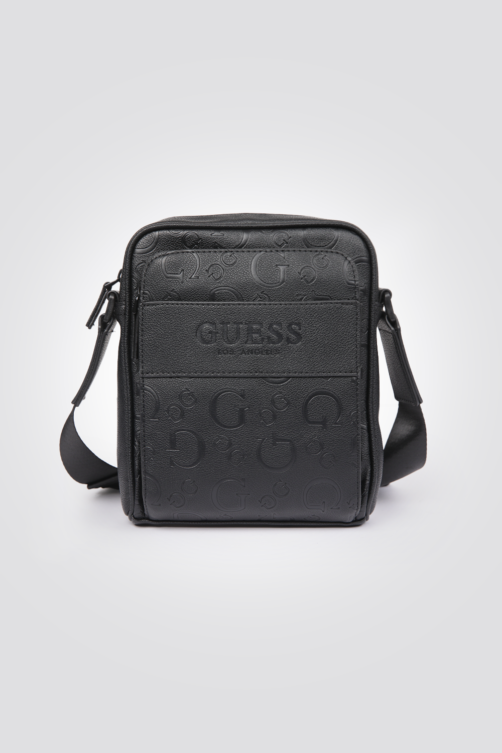 תיק צד לגברים מבית המותג GUESS, בעיצוב קלאסי ,בצבע אפור כהה, שני תאים עם סגירת רוכן ורצועת צד.