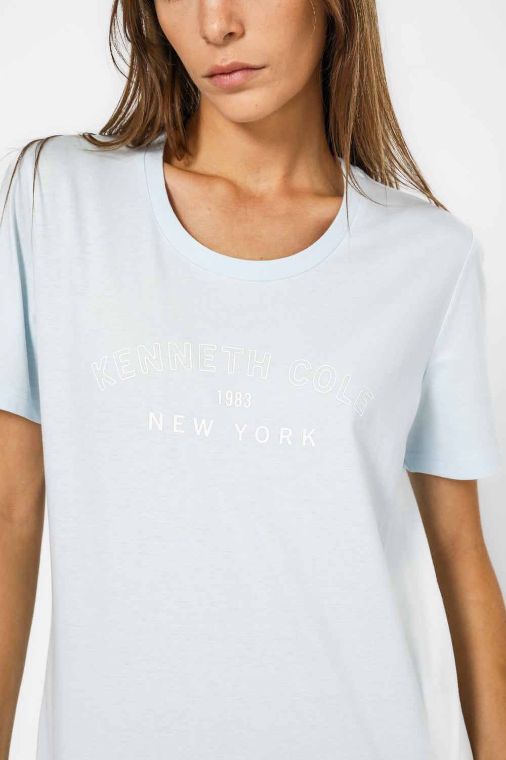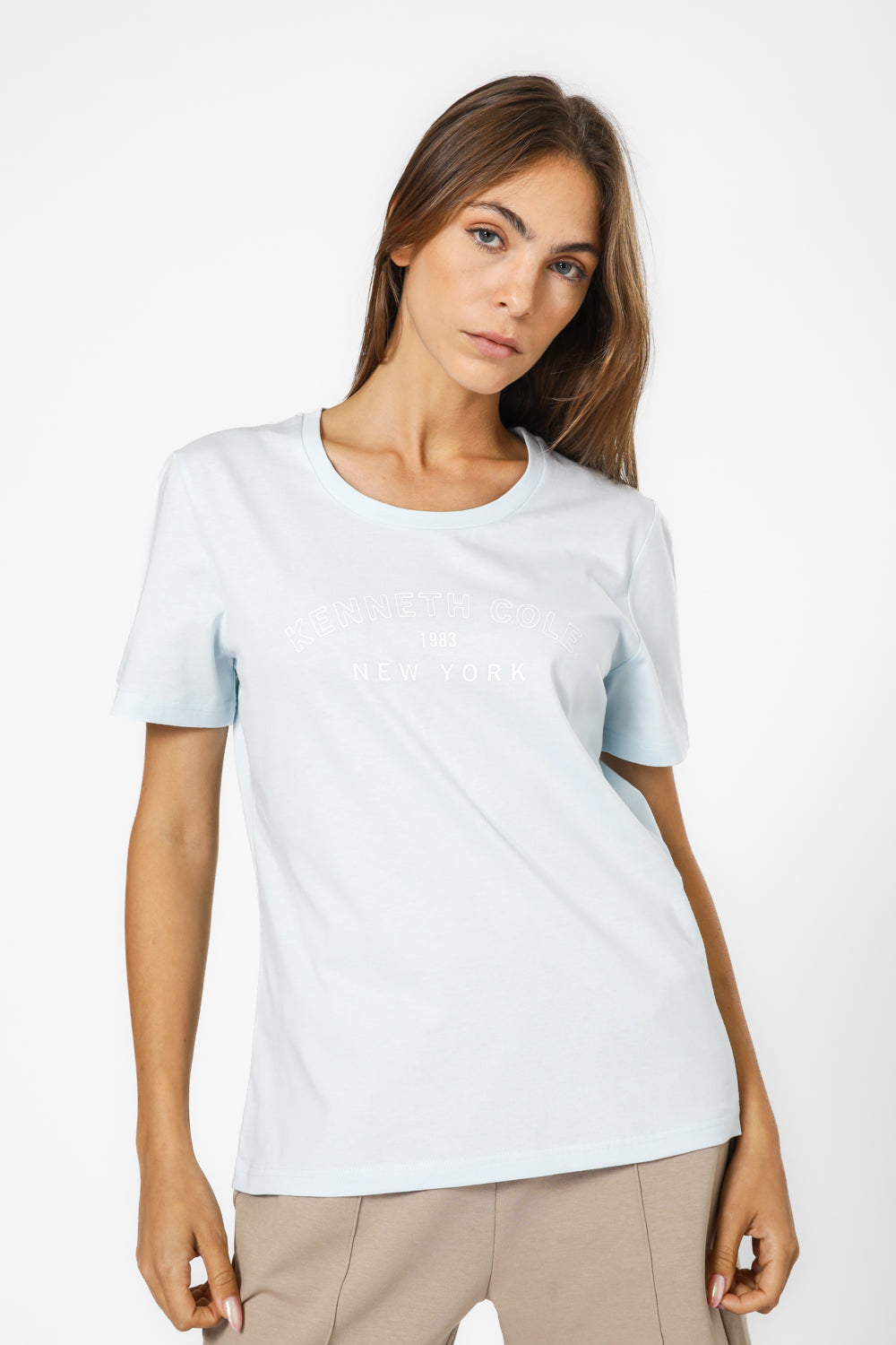 טישירט לנשים מבית המותג KENNETH COLE, קלילה ונוחה , בצבע תכלת עם לוגו המותג , צווארון עגול ושרוולים קצרים.