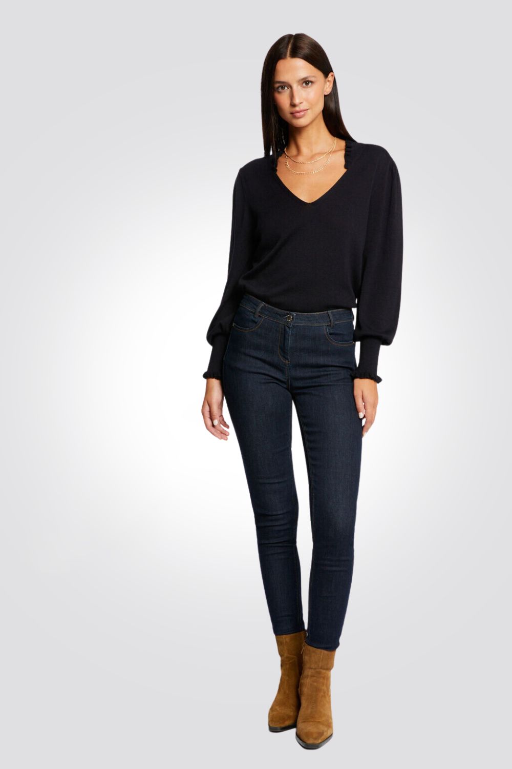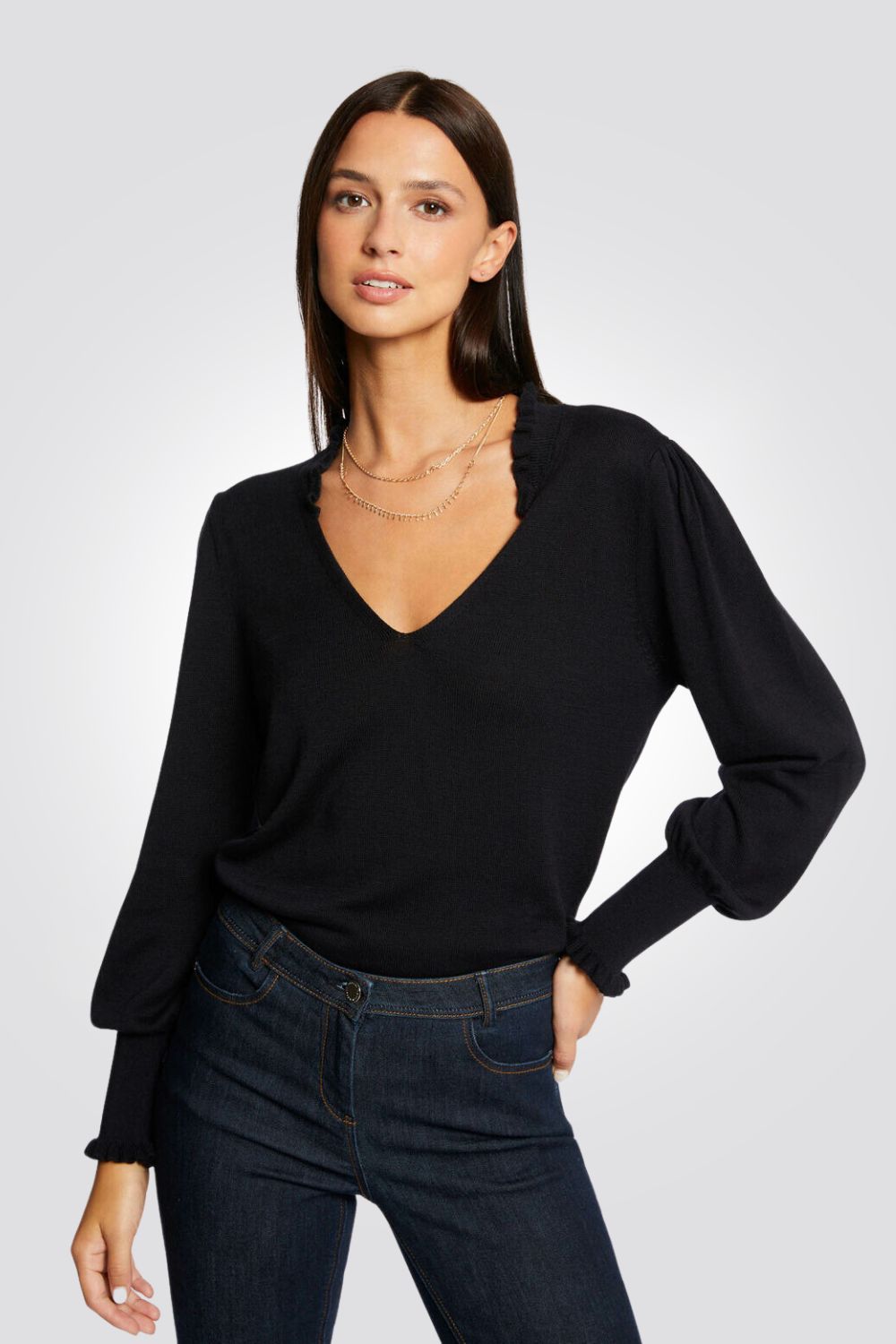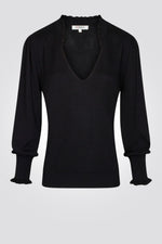 סריג נשים וי עם וולן במפתח עם שרוול עשיר בכחול