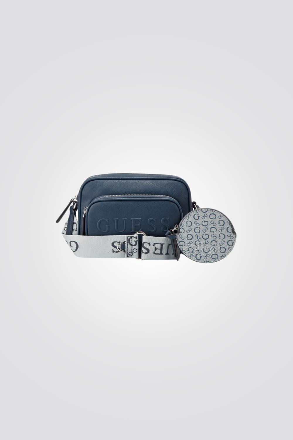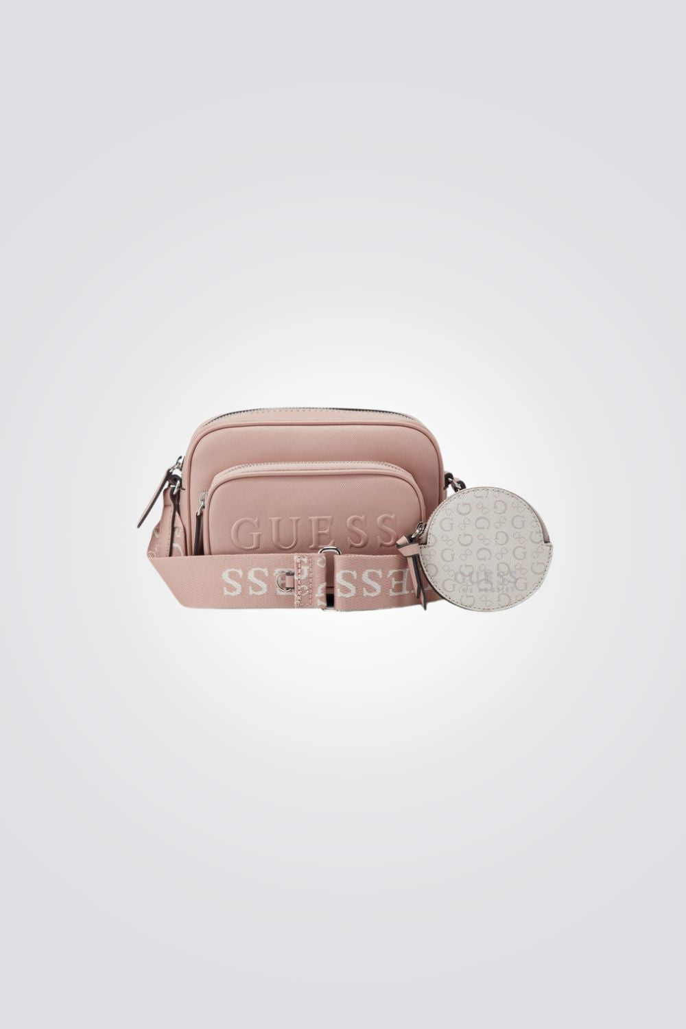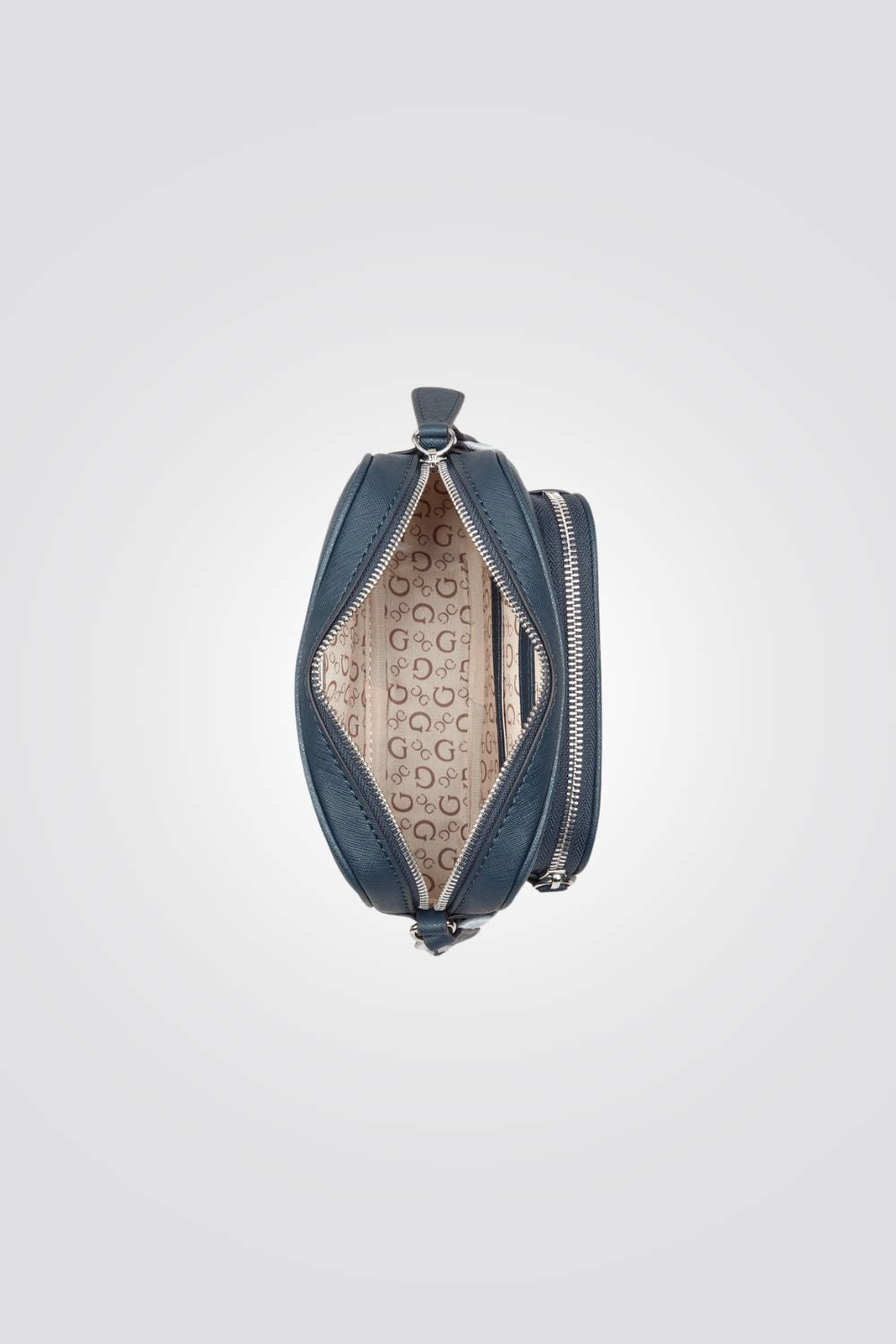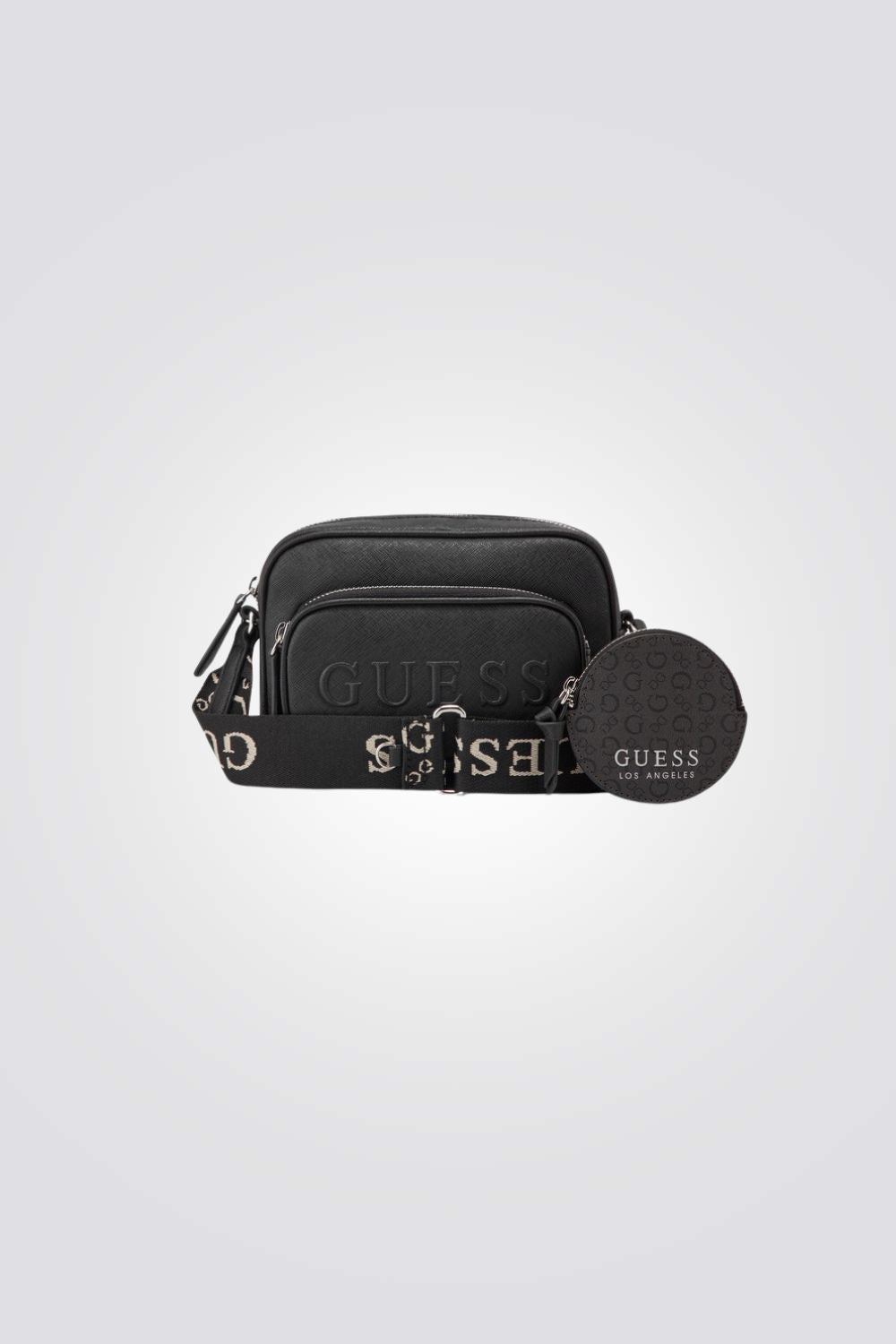 תיק צד לנשים מבית המותג GUESS, בעיצוב קלאסי ונקי, שני תאים עם סגירת רוכסן , רצועת צד עבה וארנק קטן מחובר .