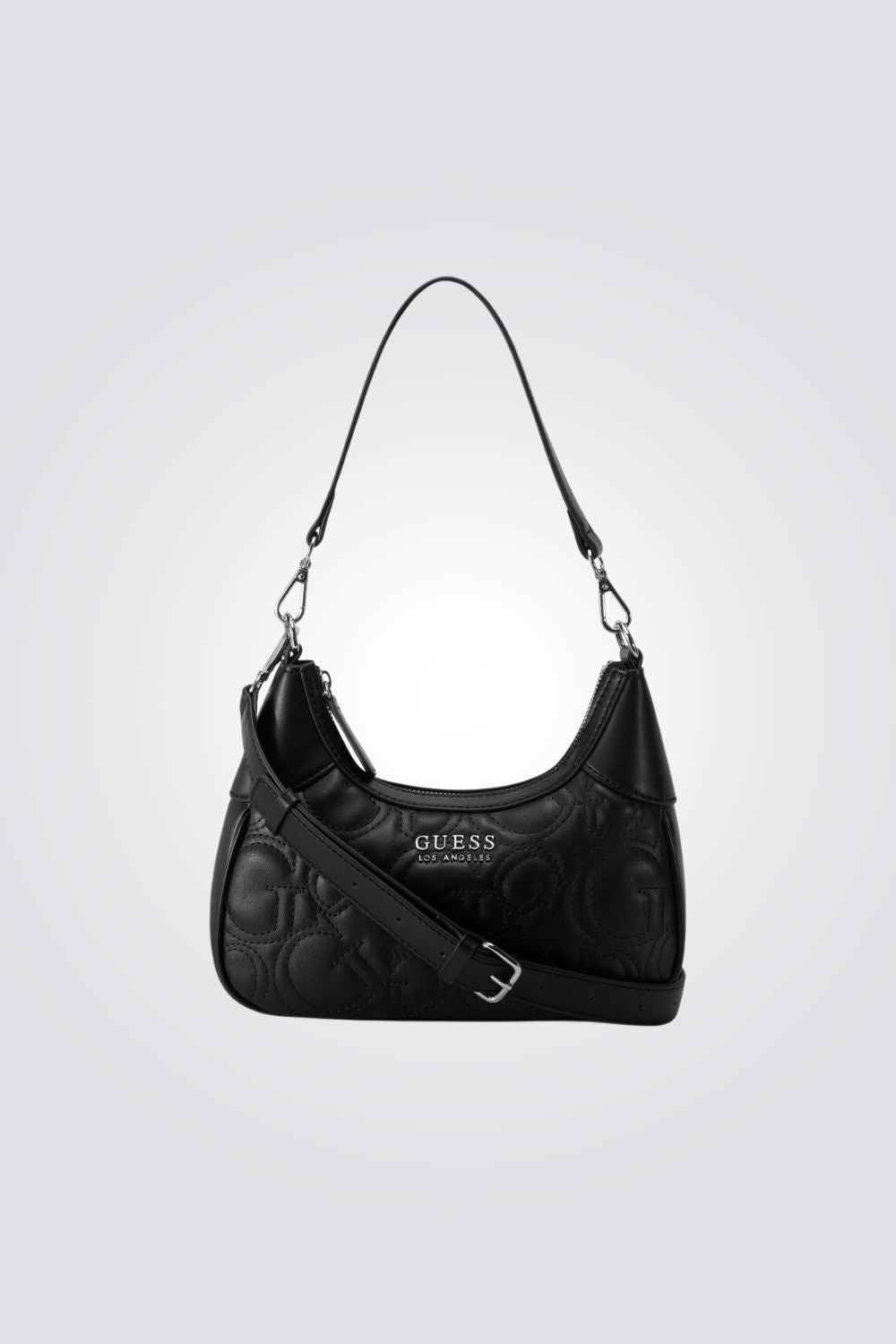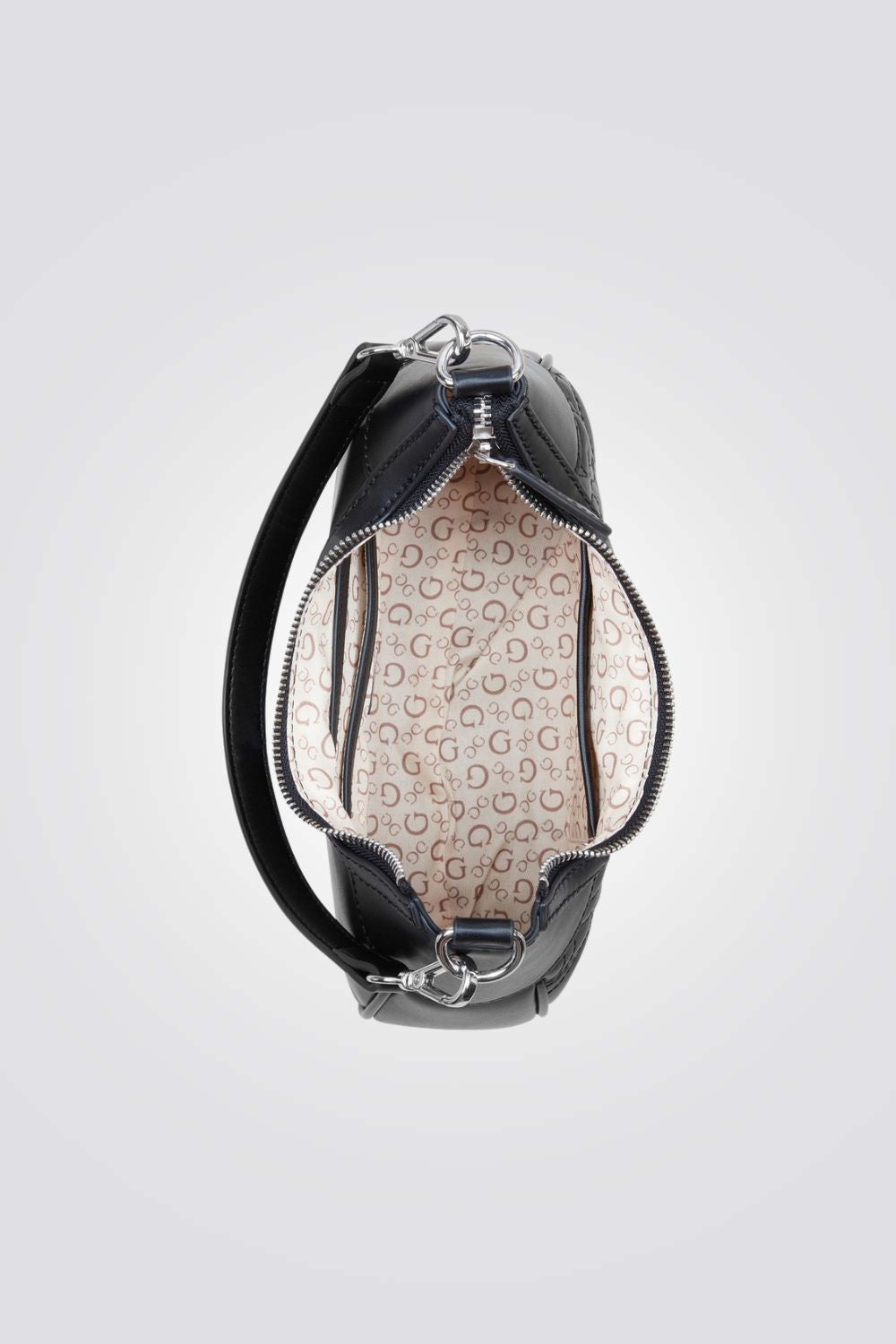 תיק יד לנשים מבית המותג GUESS, בעיצוב קלאסי ,תא אחד עם סגירת רוכסן , רצועת יד ועוד רצועת צד.