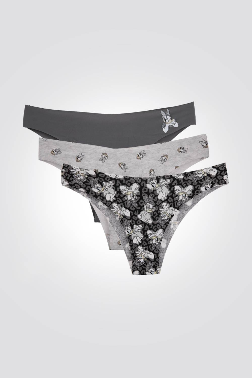 שלישיית תחתוני חוטיני מבית המותג DELTA, בלתי נראים מתחת לבגדים, מבד נעים ללא תפרים, בהדפסים מתוקים של דייזי ובגווני אפור ושחור.