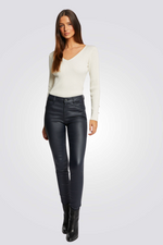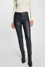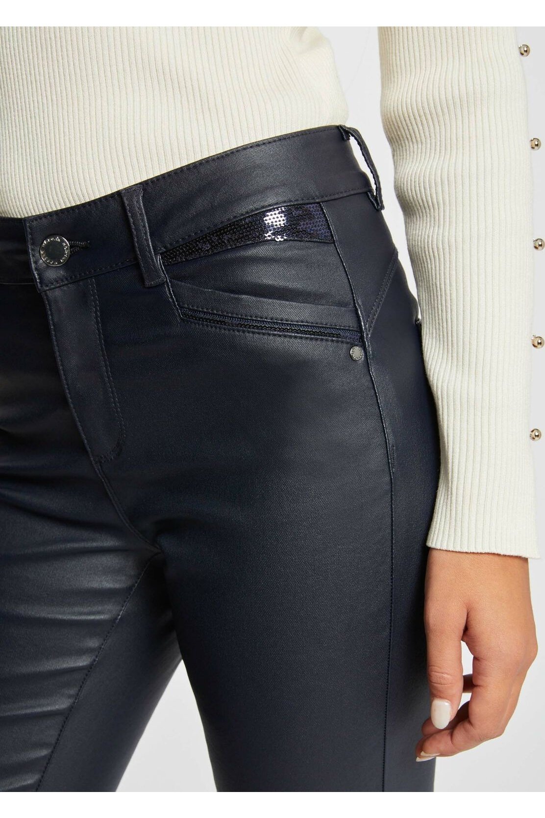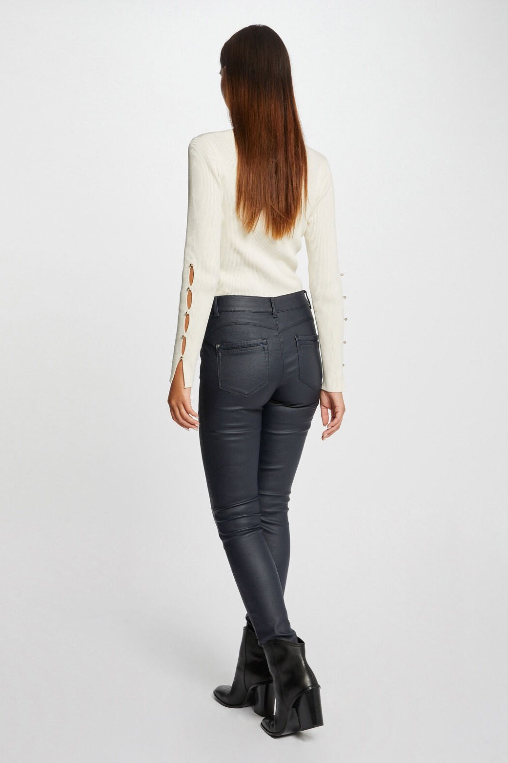 מכנסי סקיני מבית המותג MORGAN, צבע כחול כהה, גזרה צמודה עם רוכסן וכפתור בחזית, 2 כיסים מלוכסנים מקדימה , הרכב בד 77% ויסקוזה, 21% פוליאמיד 2% אלסטן