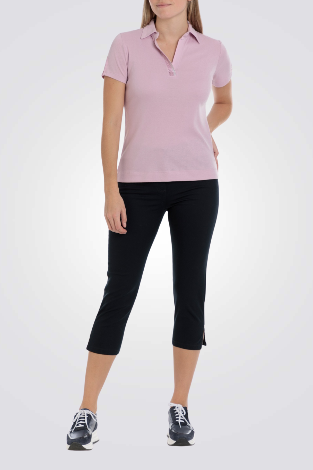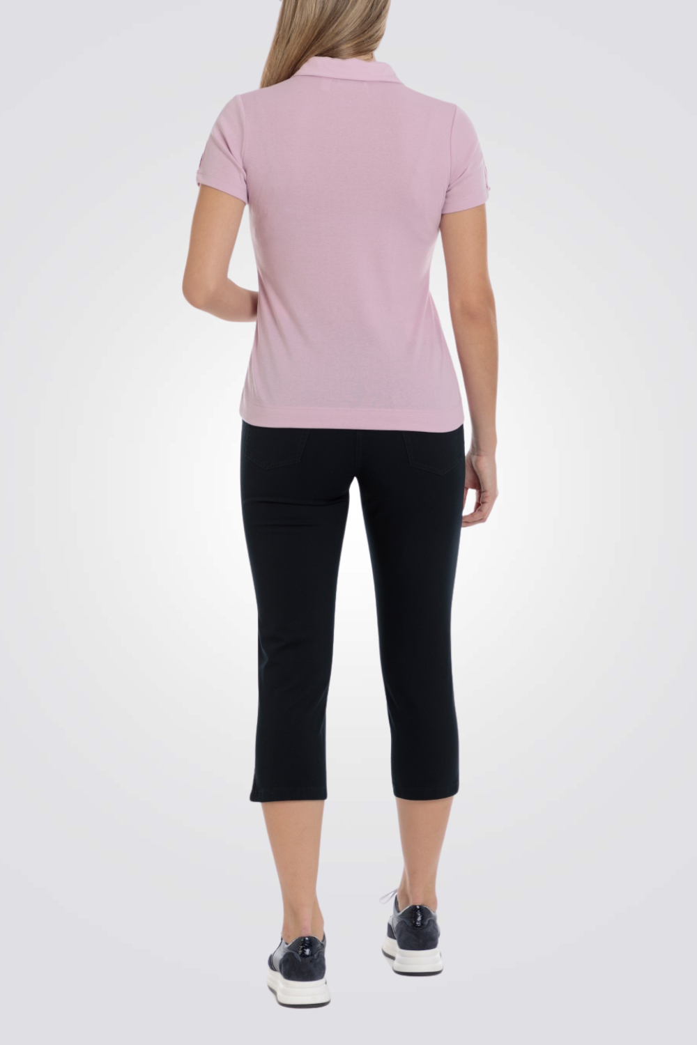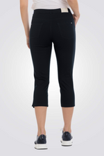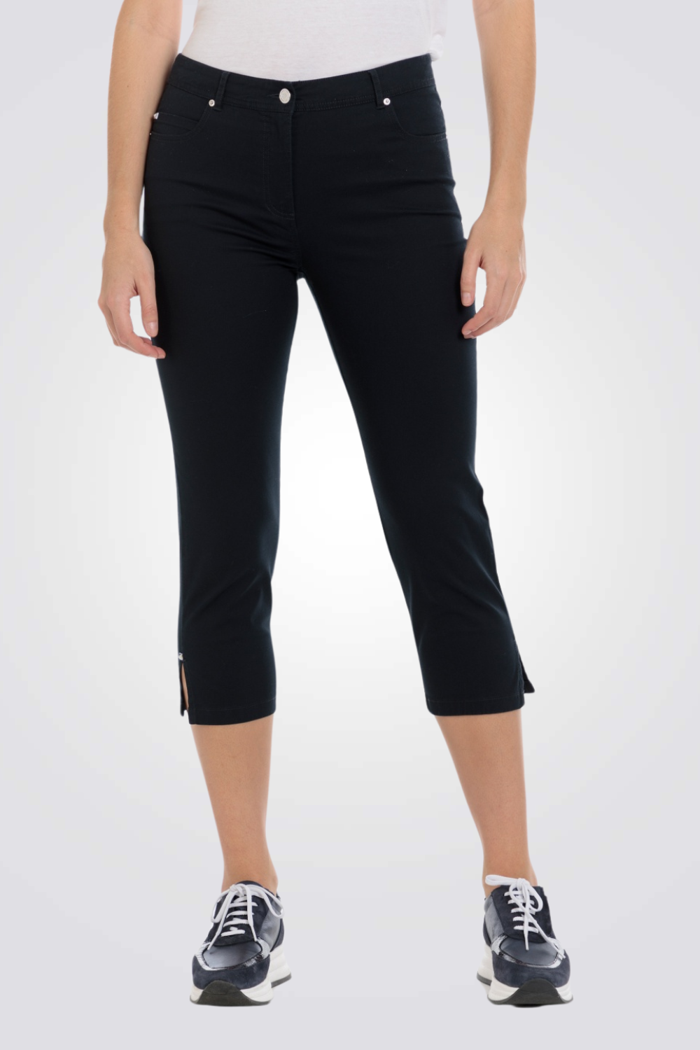 מכנסי כותנה לנשים מבית המותג PUNT ROMA באורך 3/4, בצבע נייבי, עם 5 כיסים, סגירת רוכסן וכפתור.