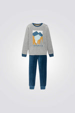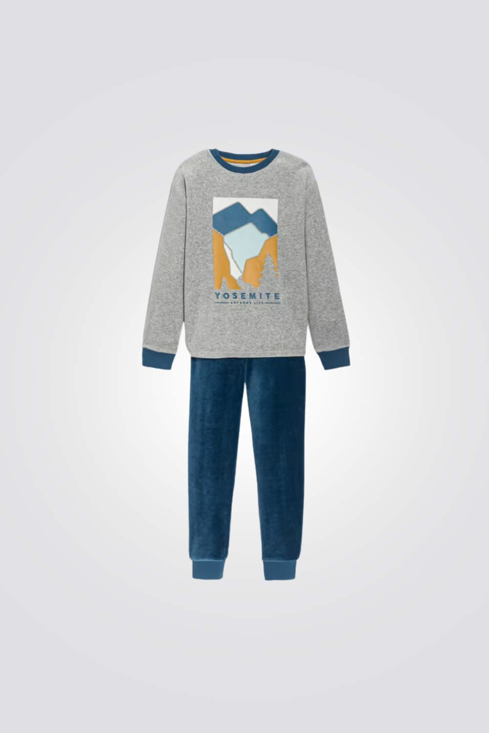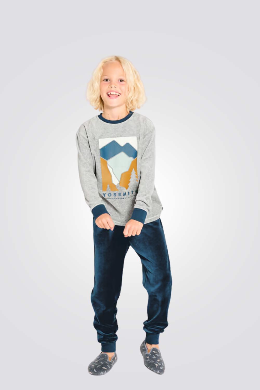 סט פיג'מת קטיפה לילדים בצבע אפור וכחול