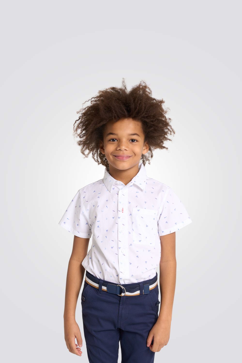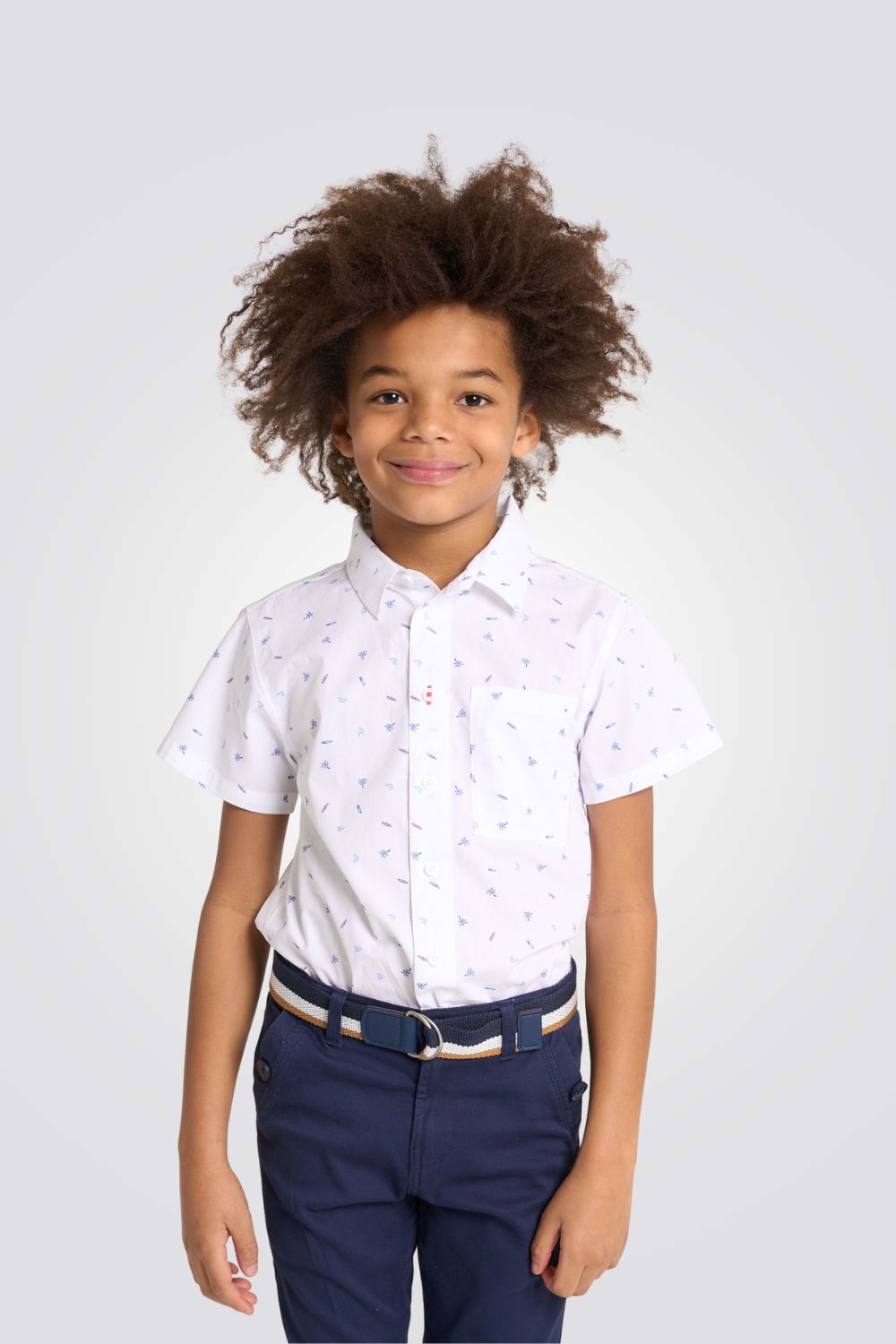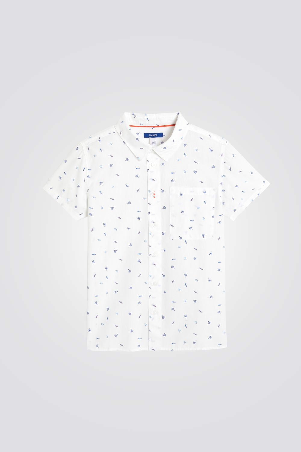 חולצה מכופתרת קצרה לילדים מבית המותג OKAIDI , בצבע לבן עם הדפס ,בגזרה ישרה, עם צווארון קלאסי וכיס חזה.